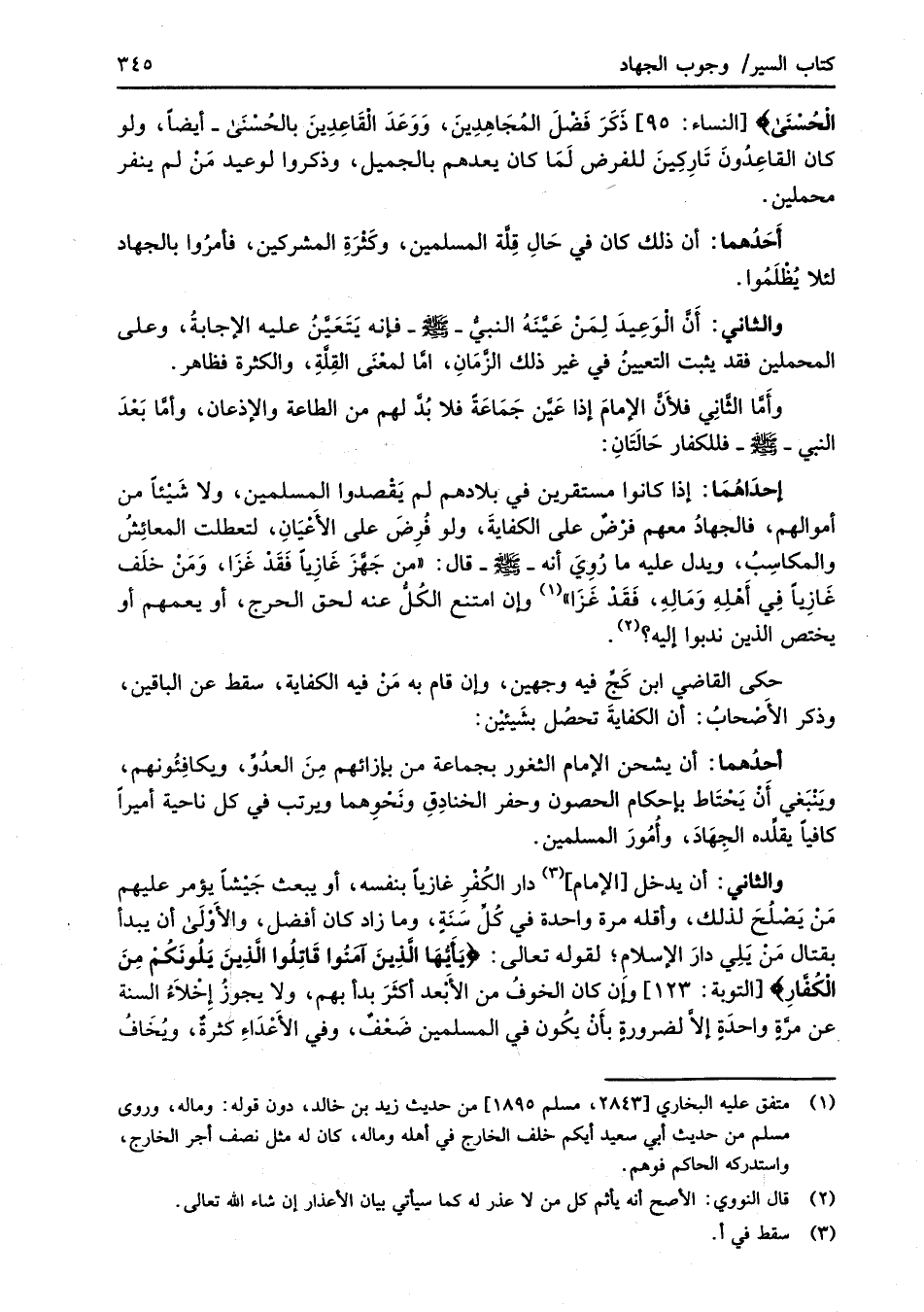 الْحُسْنَى} [النساء: 95] ذَكَرَ فَضْلَ المُجَاهِدِينَ، وَوَعَدَ الْقَاعِدِينَ بالحُسْنَى -أيضًا، ولو كان القَاعِدُونَ تَارِكِينَ للفرض لَمَا كان يعدهم بالجميل، وذكروا لوعيد مَنْ لم ينفر محملين.