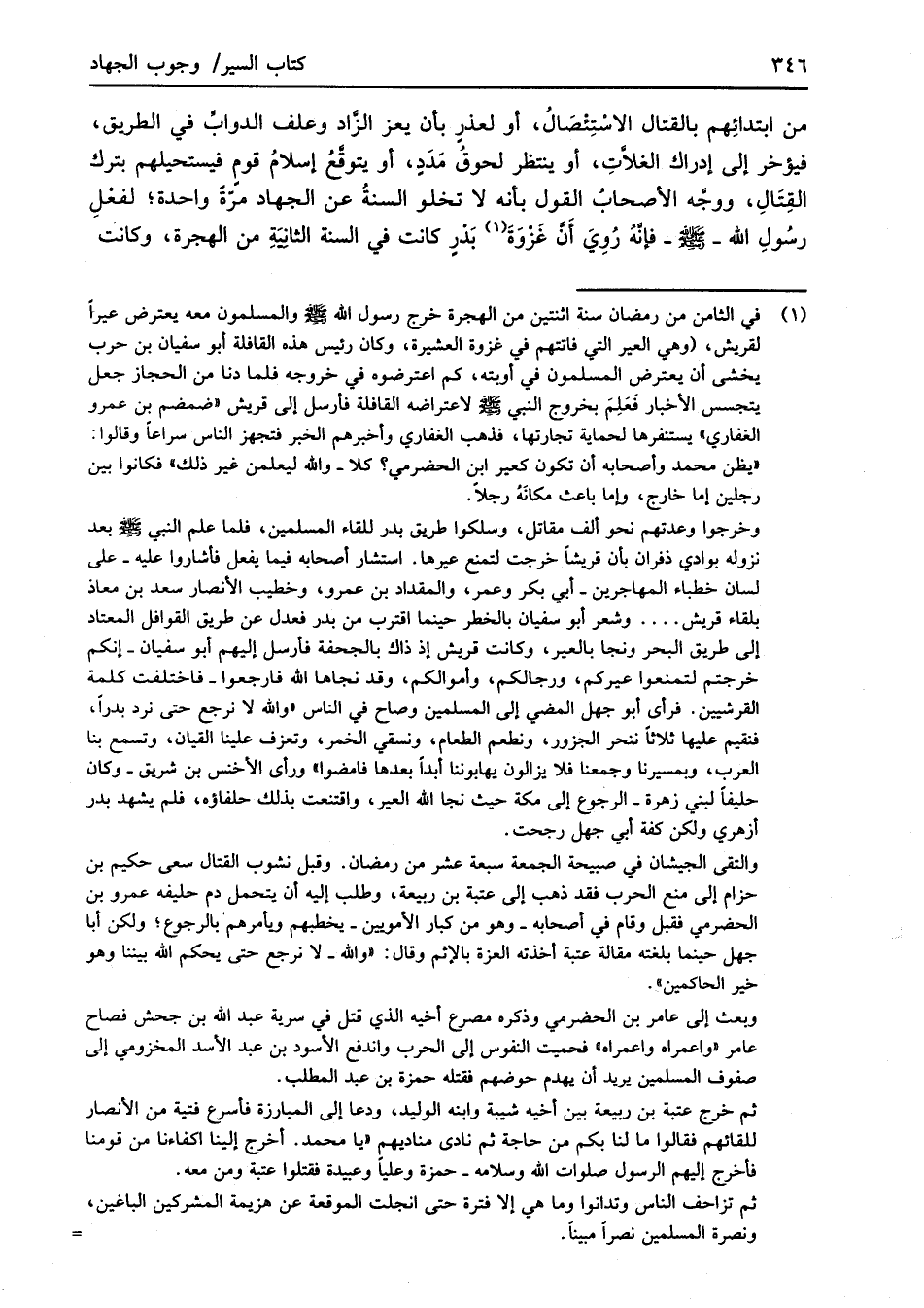 من ابتدائِهم بالقتال الاسْتِئْصَالُ، أو لعذرٍ بأن يعز الزَّاد وعلف الدوابِّ في الطريق، فيؤخر إلى إدراك الغلاَّتِ، أو ينتظر لحوقُ مَدَدٍ، أو يتوقَّعُ إسلامُ قومٍ فيستحيلهم بترك القِتَالِ، ووجَّه الأصحابُ القول بأنه لا تخلو السنةُ عن الجهاد مرّةً واحدة؛ لفعْلِ رسُولِ الله -صلى الله عليه وسلم- فإنَّهُ رُوِيَ أَنَّ غَزْوَةَ (¬1) بَدْرٍ كانت في السنة الثانِيَةِ من الهجرة، وكانت