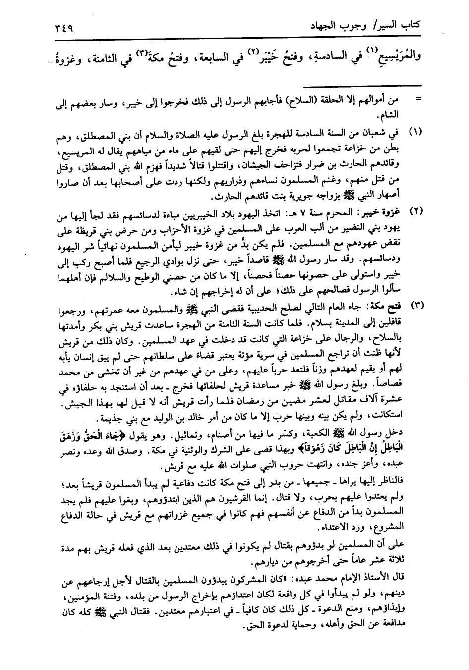 قال الأستاذ الامام محمد عبده: "كان المشركون يبدؤون المسلمين بالقتال لأجل إرجاعهم عن دينهم، ولو لم يبدأوا في كل واقعة لكان اعتداؤهم بإخراج الرسول من بلده، وفتنة المؤمنين، وإيذاؤهم، ومنع الدعوة -كل ذلك كان كافيًا- في اعتبارهم معتدين. فقتال النبي -صلى الله عليه وسلم- كله كان مدافعة عن الحق وأهله، وحماية لدعوة الحق.