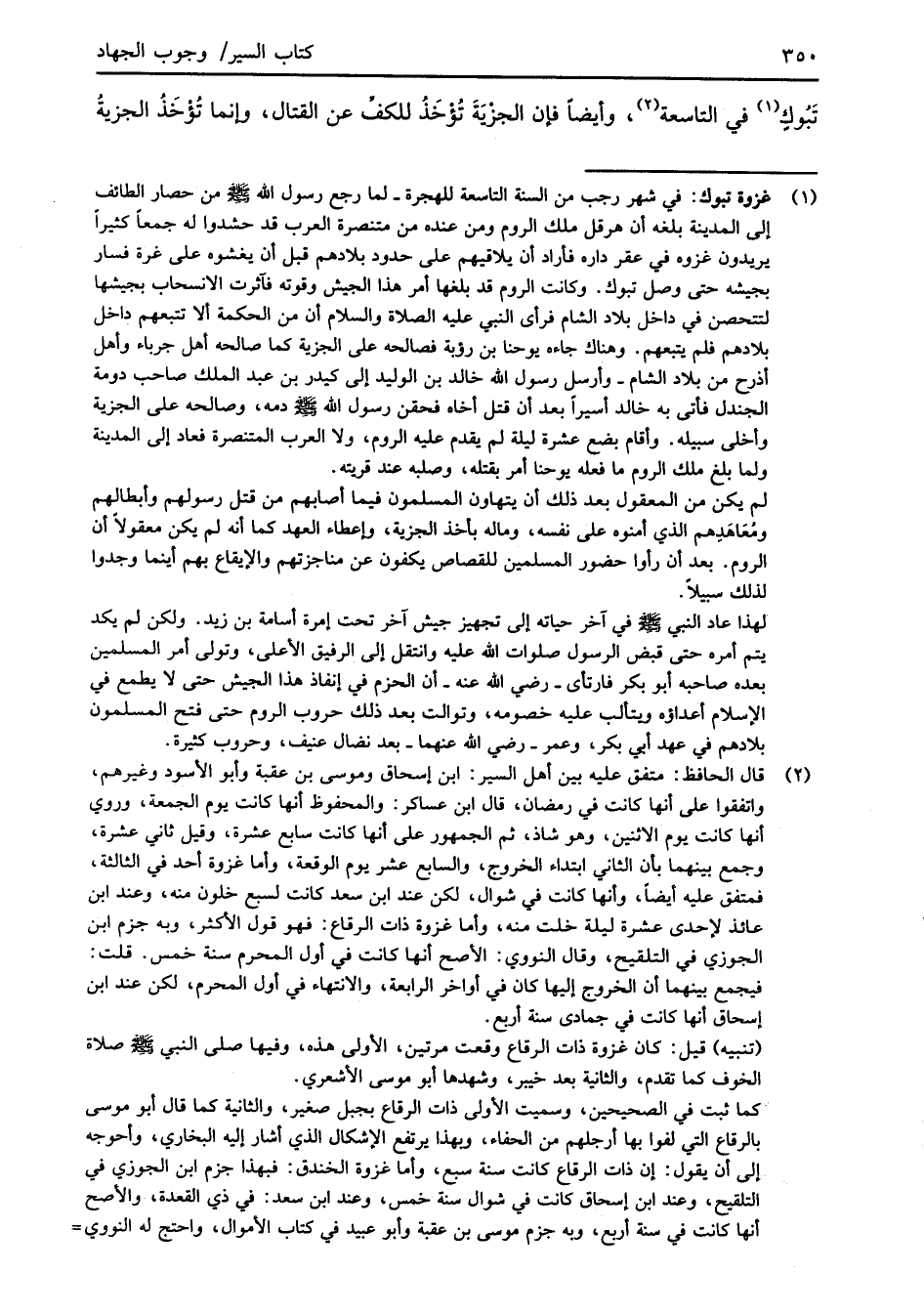(¬1) غزوة تبوك: في شهر رجب من السنة التاسعة للهجرة -لما رجع رسول الله -صلى الله عليه وسلم- من حصار الطائف إلى المدينة بلغه أن هرقل ملك الروم ومن عنده من متنصرة العرب قد حشدوا له جمعًا كثيرًا يريدون غزوه في عقر داره فأراد أن يلاقيهم على حدود بلادهم قبل أن يغشوه على غرة فسار بجيشه حتى وصل تبوك. وكانت الروم قد بلغها أمر هذا الجيش وقوته فآثرت الانسحاب بجيشها لتتحصن في داخل بلاد الشام فرأى النبي عليه الصلاة والسلام أن من الحكمة ألا تتبعهم داخل بلادهم فلم يتبعهم. وهناك جاءه يوحنا بن رؤبة فصالحه على الجزية كما صالحه أهل جرباء وأهل أذرح من بلاد الشام -وأرسل رسول الله خالد بن الوليد إلى كيدر بن عبد الملك صاحب دومة الجندل فأتى به خالد أسيراً بعد أن قتل أخاه فحقن رسول الله -صلى الله عليه وسلم- دمه، وصالحه على الجزية وأخلى سبيله. وأقام بضع عشرة ليلة لم يقدم عليه الروم، ولا العرب المتنصرة فعاد إلى المدينة ولما بلغ ملك الروم ما فعله يوحنا أمر بقتله، وصلبه عند قريته.