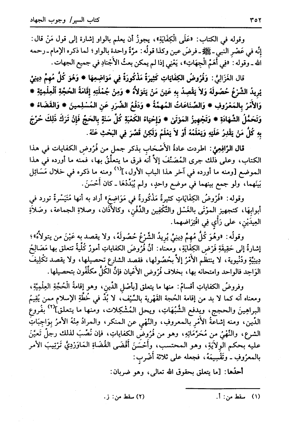وقوله: "فُرُوضُ الكِفَايَاتِ كثيرةٌ مَذْكُورةٌ في مَوَاضِعَ" أراد به أنها مُتَيَسِّرةٌ تورد في أبوابِهَا، كتجهيز الموْتَى بالغَسْل والتَّكْفِين والدَّفْنِ، وكالأذَان، وصلاةِ الجماعة، وصَلاَةِ العِيدَيْنِ، على رَأْيٍ في افْتِراضهما.