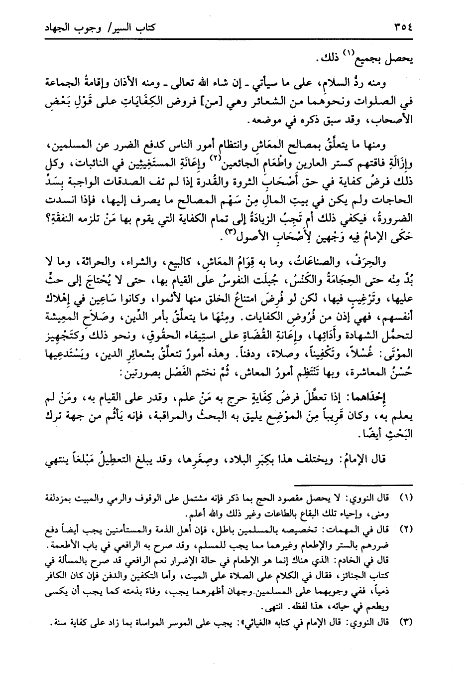 والحِرَفُ، والصناعاتُ، وما به قِوَامُ المعَاشِ، كالبيع، والشراء، والحراثة، وما لا بُدَّ مِنه حتى الحِجَامَةُ والكَنْسُ، جُبلَت النفوسُ على القيام بها، حتى لا يُحْتاجَ إلى حثٍّ عليها، وتَرْغِيبٍ فيها، لكن لو فُرِضَ امتناعُ الخلق منها لأثموا، وكانوا سَاعِين في إِهْلاك أنفسهم، فهي إذن من فُرُوضِ الكفايات. ومِنْهَا ما يتعلَّقُ بأمر الدِّين، وصَلاحَ المعِيشة لتحمُّل الشهادة وأَدَائِها، وإِعانةِ القُضَاةِ على استِيفاء الحقُوقِ، ونحو ذلك وكتَجْهِيز الموْتَى: غُسْلاً، وتَكْفِيناً، وصلاة، ودفناً. وهذه أمورٌ تتعلَّقُ بشعائِرِ الدين، ويَسْتَدعِيها حُسْنُ المعاشرة، وبها تَنْتَظِم أمورُ المعاش، ثُمَّ نختم الفَصْل بصورتين: