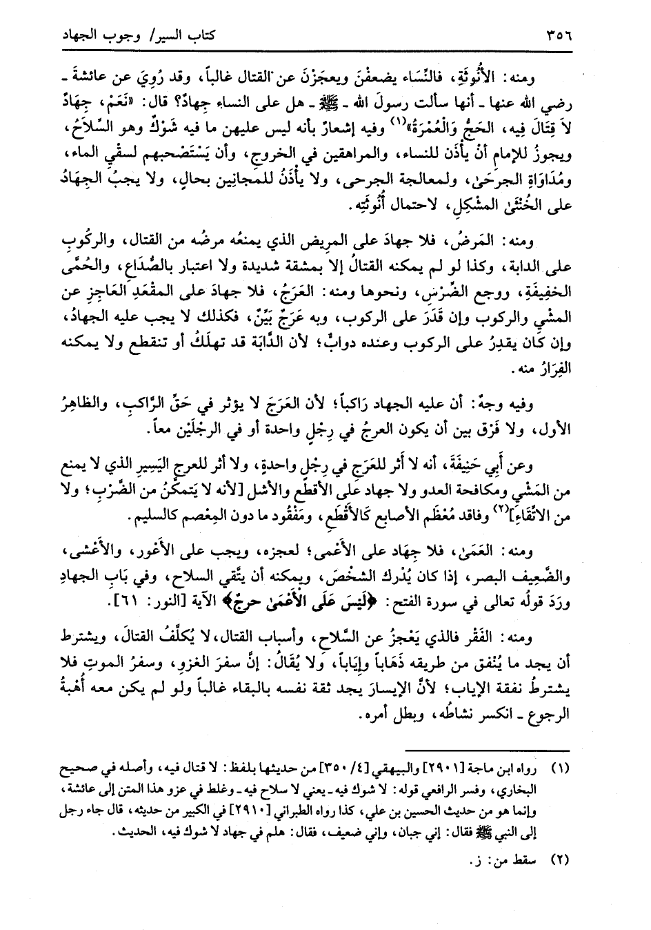 ومنه: الأُنُوثَة، فالنِّسَاء يضعفْنَ ويعجَزْنَ عنْ القتال غالبًا، وقد رُوِيَ عن عائشةَ -رضي الله عنها- أنها سألت رسولَ الله -صلى الله عليه وسلم- هل على النساء جِهادٌ؟ قال: "نَعَمْ، جِهَادٌ لا قِتَالَ فِيه، الحَجُّ والعُمْرَةُ" (¬1) وفيه إشعارٌ بأنّه ليس عليهن ما فيه شَوْكٌ وهو السلاَحُ، ويجوزُ للإمام أنْ يأْذَن للنساء، والمراهقين في الخروج، وأن يَسْتَصْحبهم لسقْي الماء، ومُدَاوَاةِ الجرحَى، ولمعالجة الجرحى، ولا يأْذَنُ للمَجانِين بحالٍ، ولا يجبُ الجِهَادُ على الخُنْثَى المشْكِلِ، لاحتمال أُنُوثَتِه.