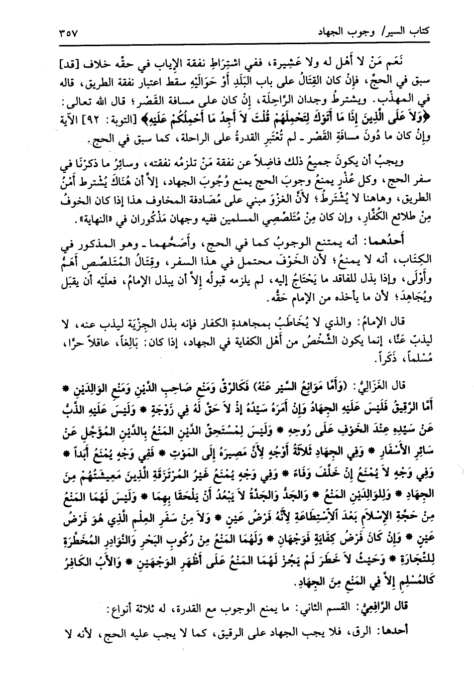 قال الغَزَالِيُّ: (وَأَمَّا مَوَانِعُ السَّيْر عَنْهُ) فَكَالرِّقِّ وَمَنْعِ صَاحِبِ الدَّيْنِ وَمَنْعِ الوَالِدَيْنِ* أَمَّا الرَّقِيقُ فَلَيْسَ عَلَيْهِ الجِهَادُ وَإِنْ أَمَرَهُ سَيِّدُهُ إِذْ لاَ حَقَّ لَهُ فِي زَوْجَةٍ* وَلَيْسَ عَلَيْهِ الذَّبُّ عَنْ سَيِّدِهِ عِنْدَ الخَوْفِ عَلَى رُوحِهِ* وَلَيْسَ لِمْسُتَحِقِّ الدَّيْنِ المَنْعُ بِالدَّيْنِ المُؤَجَّلِ عَنْ سَائِرِ الأَسْفَارِ* وَفِي الجِهَادِ ثَلاَثةُ أَوْجُهٍ لِأَنَّ مَصِيرَهُ إِلَى المَوْتِ* فَفِي وجْهٍ يُمْنَعُ أَبَدًا* وَفِي وَجْهٍ لا يُمْنَعُ إِنْ خَلَّفَ وَفَاءً* وَفِي وَجْهٍ يُمْنَعُ غَيْرُ المُرْتَزَقَةِ الَّذِينَ مَعِيشَتُهُمْ مِنَ الجِهَادِ* وَلِلوَالِدَيْنِ المَنْعُ* وَالجَدُّ والجَدَّةُ لا يَبْعُدُ أَنْ يَلْحَقَا بِهِمَا* وَلَيْسَ لَهُمَا المَنْعُ مِنْ حَجَّةِ الإِسْلاَمِ بَعْدَ الاسْتِطَاعَةِ لِأَنَّهُ فَرْضُ عَيْنٍ* وَلاَ مِنْ سَفَرِ العِلْمِ الَّذِي هُوَ فَرْضُ عَيْنٍ* وإِنْ كَانَ فَرْضُ كِفَايَةٍ فَوَجْهَانِ* وَلَهُمَا المنْعُ مِنْ ركُوبِ البَحْرِ والنَّوَادِرِ المُخَطَّرَةِ لِلتِّجَارَةِ* وَحَيْثُ لاَ خَطَرَ لَمْ يَجُزْ لَهُمَا المَنْعُ عَلَى أَظْهَرِ الوَجْهَيْنِ* والأَبُ الكَافِرُ كَالمُسْلِمِ إلاَّ فِي المَنْعِ مِنَ الجِهَادِ.