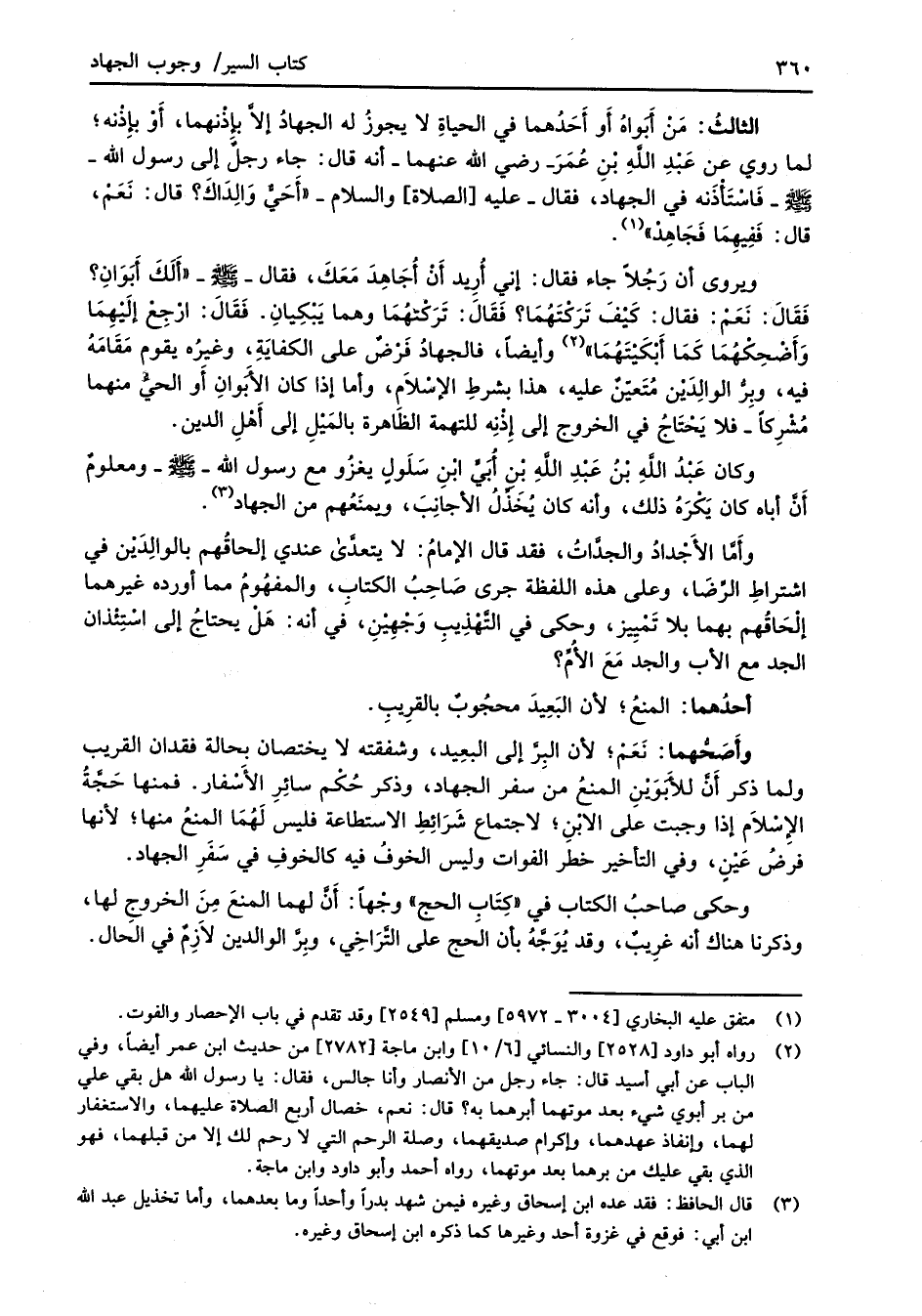 الثالثُ: مَنْ أَبَواهُ أَو أَحَدُهما في الحياةِ لا يجوزُ له الجهادُ إلاَّ بإذْنهما، أَوْ بإِذْنه؛ لما روي عن عَبْدِ اللهِ بْنِ عُمَرَ -رضي الله عنهما- أنه قال: جاء رجلٌ إلى رسول الله -صلى الله عليه وسلم- فَاسْتَأْذَنه في الجهاد، فقال -عليه [الصلاة] والسلام- "أَحَيٌّ وَالِدَاكَ؟ قال: نَعَمْ، قال: فَفِيهِمَا فَجَاهِدْ" (¬1). ويروى أن رَجُلاً جاء فقال: إني أُرِيد أَنْ أُجَاهِدَ مَعَكَ، فقال -صلى الله عليه وسلم- "أَلَكَ أَبَوَانِ؟ فَقَالَ: نَعَمْ: فقال: كَيْفَ تَرَكْتَهُمَا؟ فَقَالَ: تَرَكْتهُمَا وهما يَبْكِيانِ. فَقَالَ: ارْجِعْ إلَيْهِمَا وَأَضْحِكْهُمَا كَمَا أَبْكَيْتَهُمَا" (¬2) وأيضاً، فالجهادُ فَرْضٌ على الكفايَةِ، وغيرُه يقوم مَقَامَهُ فيه، وبِرُّ الوالِدَيْن مُتَعيّنٌ عليه، هذا بشرطِ الإسْلاَم، وأما إذا كان الأَبَوانِ أَو الحيُّ منهما مُشْرِكاً -فلا يَحْتَاجُ في الخروج إلى إِذْنِه للتهمة الظَاهرة بالمَيْلِ إلى أَهْلِ الدين.