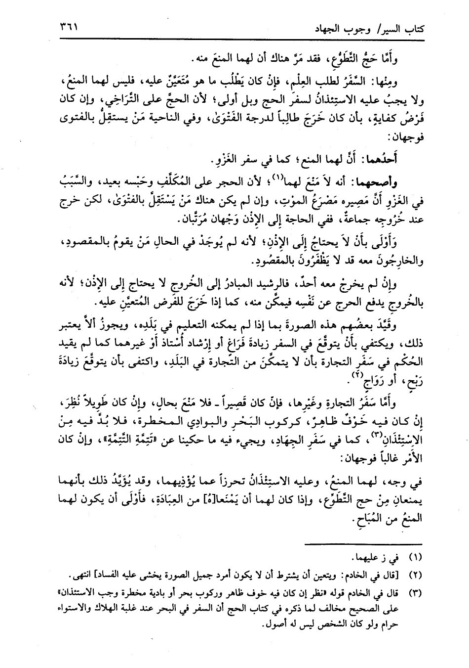 (¬3) قال في الخادم قوله "نظر إن كان فيه خوف ظاهر وركوب بحر أو بادية مخطرة وجب الاستئذان" على الصحيح مخالف لما ذكره في كتاب الحج أن السفر في البحر عند غلبة الهلاك والاستواء حرام ولو كان الشخص ليس له أصول.