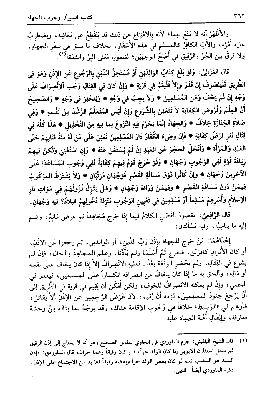 قال الغَزَالِيُّ: وَلَوْ بَلَغَ كِتَابُ الوالِدَيْنِ أَوْ مُسْتَحِقُّ الدَّيْنِ بِالرُّجُوعِ عَنِ الإِذْنِ وَهُوَ فِي الطَّرِيقِ فَلْيَنْصَرِفْ إِنْ قَدَرَ وإِلاَّ فَلْيَقُمْ فِي قَرْيَةٍ* وَإِنْ كَانَ فِي القِتَالِ وَجَبَ الانْصِرَافُ عَلَى وَجْهٍ إِنْ لَمْ يَخَفْ وَهَن المُسْلمِينَ* وَلاَ يَجِبُ فِي وَجْهٍ* وَيُتَخَيَّرُ فِي وَجْهٍ* وَالصَّحِيحُ أَنَّ العِلْمَ وَفُرُوضَ الكِفَايَةِ لا تَتَعَيَّنُ بِالشُّرُوعِ وَإِنْ أَنِسَ المُتَعَلِّمُ الرُّشْدَ مِنْ نَفْسِهِ* وَفِي صَلاَةِ الجَنَازَةِ خِلاَفٌ* وَالجِهَادُ إِنَّمَا يَحْرُمُ فِيهِ النُّزُوعُ لِمَا فِيهِ مِنَ التَّخْذِيلِ* هَذَا كُلُّهُ فِي قِتالِ نَفَرٍ فَرْضُ كِفَايَةٍ* فَإِنْ وَطِئَ الكُفَّارُ دَارَ المُسْلِمِينَ تَعَيَّنَ عَلَى مَنْ لَهُ مُنَّةُ قِتَالِهِمْ حَتَّى العَبْدِ وَالمَرْأَةِ* وَانْحَلَّ الحَجْرُ عَنِ العَبْدِ إِنْ لَمْ يُسْتَغْنَ عَنْهُ* وَإِنِ اسْتُغْنِيَ وَلَكِنْ فِيهِمْ زِيَادَةُ قُوَّةٍ فَفِي الوُجُوبِ وَجْهَانِ* وَلَوْ خَرَجَ قَوْمٌ فِيهِمْ كِفَايَةٌ فَفِي وُجُوبِ المُسَاعَدَةِ عَلَى الآخَرِينَ وَجْهَانِ* وَإِنْ كَانُوا فَوْقَ مَسَافَةِ القَصْرِ فَوَجْهَانِ مُرَتَّبَانِ* وَلاَ يُشْتَرَطُ المَرْكُوبُ فِيمَنْ دُونَ مَسَافَةِ القَصْرِ* وَفِيمَنْ وَراءَهُ وَجْهانِ* وَهَلْ يَنْزِلُ نُزُولَهُمْ فِي مَوَاتِ دارِ الإِسْلاَمِ وَأَسْرِهِمْ مُسْلِماً أَوْ مُسْلِمِينَ فِي تَعْيِينِ الوُجُوبِ مَنْزِلَةَ دُخُولِهِمْ البلاَدَ؟ فِيهِ وَجُهَانِ.