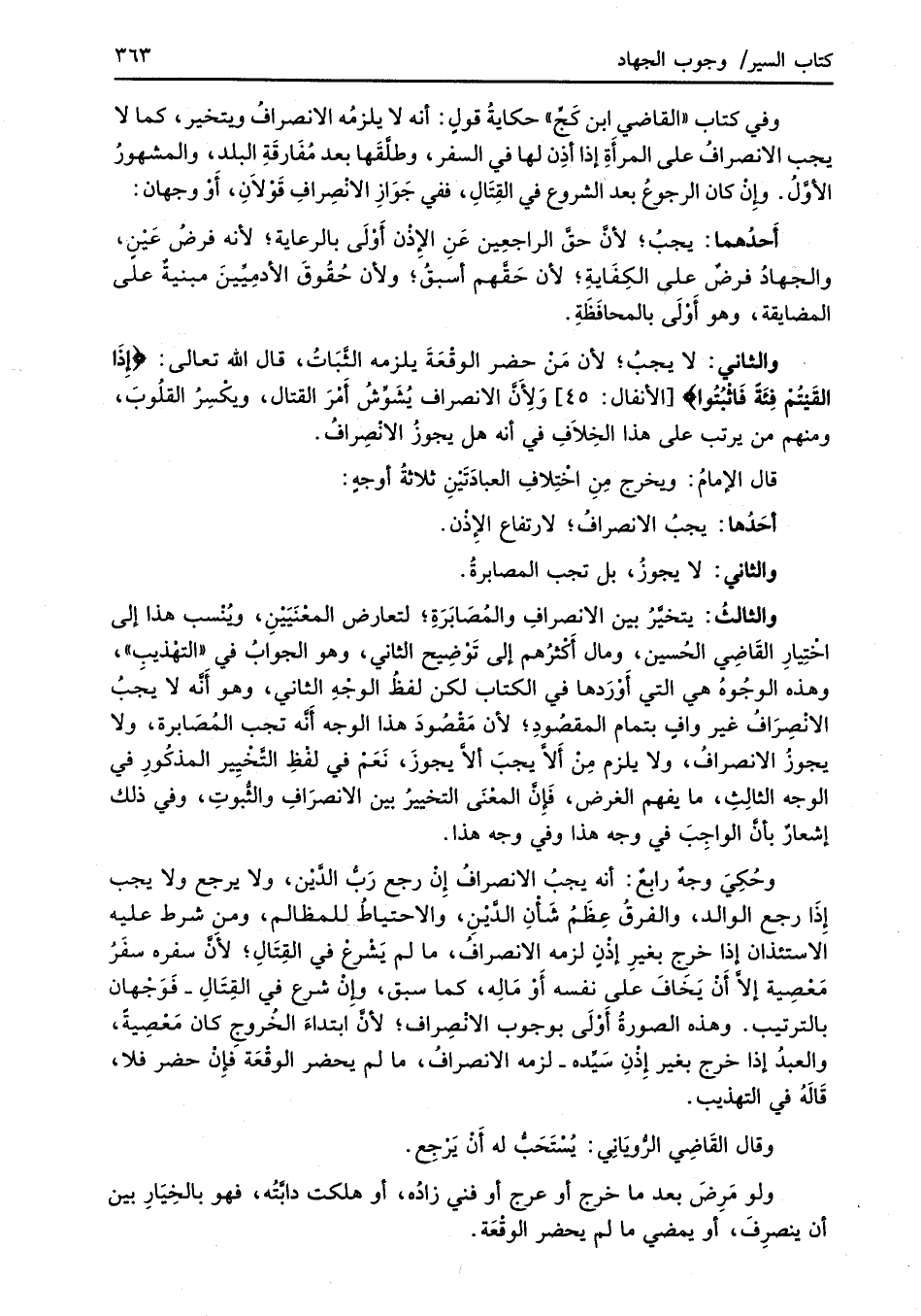 وفي كتاب "القاضي ابن كَجٍّ" حكايةُ قولٍ: أنه لا يلزمُه الانصرافُ ويتخير، كما لا يجب الانصرافُ على المرأَةِ إذا أذِن لها في السفر، وطلَّقَها بعد مُفَارقَةِ البلد، والمشهورُ الأوَّلُ. وإِنْ كان الرجوعُ بعد الشروع في القِتَالِ، ففي جَوَازِ الانْصِرافِ قَوْلاَنِ، أَوْ وجهان: