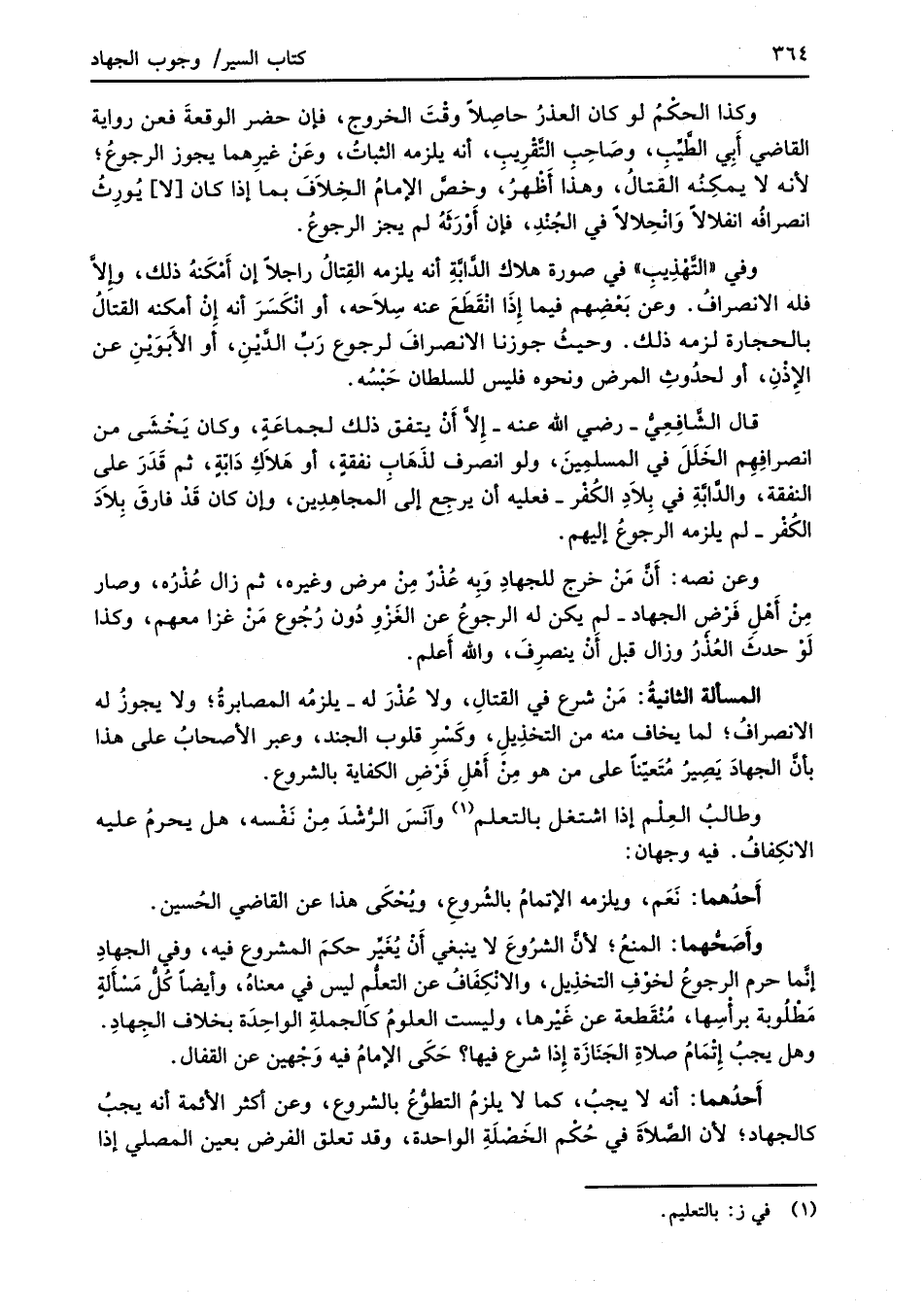 وعن نصه: أَنَّ مَنْ خرج للجهادِ وَبِه عُذْرٌ مِنْ مرض وغيره، ثم زال عُذْرُه، وصار مِنْ أَهْلِ فَرْضِ الجهاد -لمِ يكن له الرجوعُ عن الغَزْوِ دُون رُجُوع مَنْ غزا معهم، وكذا لَوْ حدثَ العُذْرُ وزال قبل أَنْ ينصرِفَ، والله أَعلم.