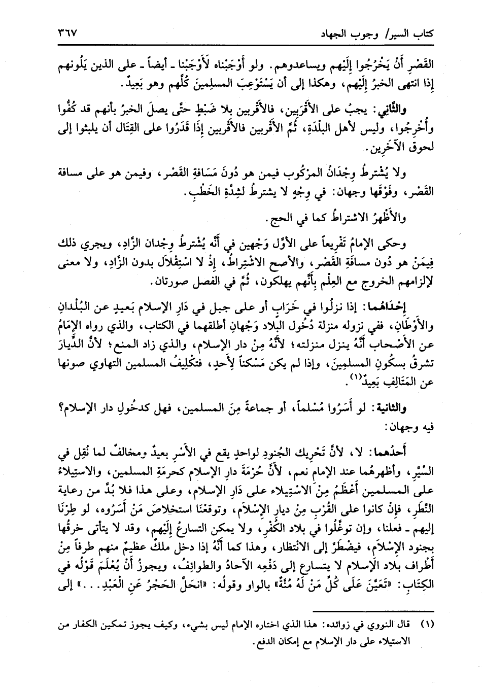 أَحدُهما: لا, لأنَّ تَحْرِيك الجُنودِ لواحدٍ يقع في الأَسْرِ بعيدٌ ومخالفٌ لما نُقِل في السَّيَّرِ، وأظهرهُما عند الإمامِ نعم؛ لأَنَّ حُرْمَةَ دارِ الإسلام كحرمَةِ المسلمين، والاستِيلاءُ على المسلمين أَعْظَمُ مِنْ الاسْتِيلاء على دَارِ الإسلام، وعلى هذا فلا بُدَّ من رعاية النَّطَرِ، فإِنْ كانوا على القُرْب مِنْ ديارِ الإِسْلاَم، وتوقعْنَا استخلاصَ مَنْ أَسَرْوه، لو طِرْنَا إليهم -فعلنا، وإن توغَّلُوا فيَ بلاد الكُفْرِ، ولا يمكن التسارعُ إِلَيْهم، وقد لا يتأتى خرقُها بجنود الإِسْلاَم، فيضْطَرَّ إلى الانْتظار، وهذا كما أَنَّهُ إذا دخل ملكٌ عظيمٌ منهم طرفاً مِنْ أَطْراف بلاد الإسلام لا يتسارع إلى دَفْعِه الآحادُ والطوائِفُ، ويجوزُ أَنْ يُعْلَمَ قوْلُه في الكِتَابِ: "تَعَيَّنَ عَلَى كُلِّ مَنْ لَهُ مُنَّةٌ" بالواو وقولُه: "انحَلَّ الحَجْرُ عَنِ الْعَبْدِ ... " إلى