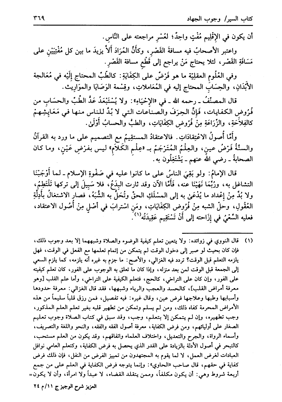 (¬1) قال النووي في زوائده: ولا يتعين تعلم كيفية الوضوء والصلاة وشبههما إلا بعد وجوب ذلك، فإن كان بحيث لو صبر إلى دخول الوقت لم يتمكن من إتمام تعلمها مع الفعل في الوقت، فهل يلزمه التعلم قبل الوقت؟ تردد فيه الغزالي، والأصح: ما جزم به غيره أنه يلزمه، كما يلزم السعي إلى الجمعة قبل الوقت لمن بعد منزله، وإذا كان ما تعلق به الوجوب على الفور، كان تعلم كيفيته على الفور، وإن كان على التراخي، كالحج، فتعلم الكيفية على التراخي، وأما علم القلب [وهو معرفة أمراض القلب]، كالحسد والعجب والرياء وشبهها، فقد قال الغزالي: معرفة حدودها وأسبابها وطبها وعلاجها فرض عين، وقال غيره: فيه تفصيل، فمن رزق قلباً سليماً من هذه الأمراض المحرمة كفاه ذلك، ومن لم يسلم وتمكن من تطهير قلبه بغير تعلم العلم المذكور، وجب تطهيره، وإن لم يتمكن إلا بتعلم، وجب، وقد سبق في كتاب الصلاة وجوب تعليم الصغار على أوليائهم، ومن فرض الكفاية، معرفة أصول الفقه والفقه، والنحو واللغة والتصريف، وأسماء الرواة، والجرح والتعديل, واختلاف العلماء واتفاقهم، وقد يكون من العلم مستحب، كالتبحر في أصول الأدلة بالزيادة على القدر الذي يحصل به فرض الكفاية، وكتعلم العامي نوافل العبادات لغرض العمل، لا لما يقوم به المجتهدون من تمييز الفرض من النفل، فإن ذلك فرض كفاية في حقهم، قال صاحب "الحاوي": وإنما يتوجه فرض الكفاية في العلم على من جمع أربعة شروط وهي: أن يكون مكلفاً، وممن يتقلد القضاء، لا عبداً ولا امرأة، وأن لا يكون =