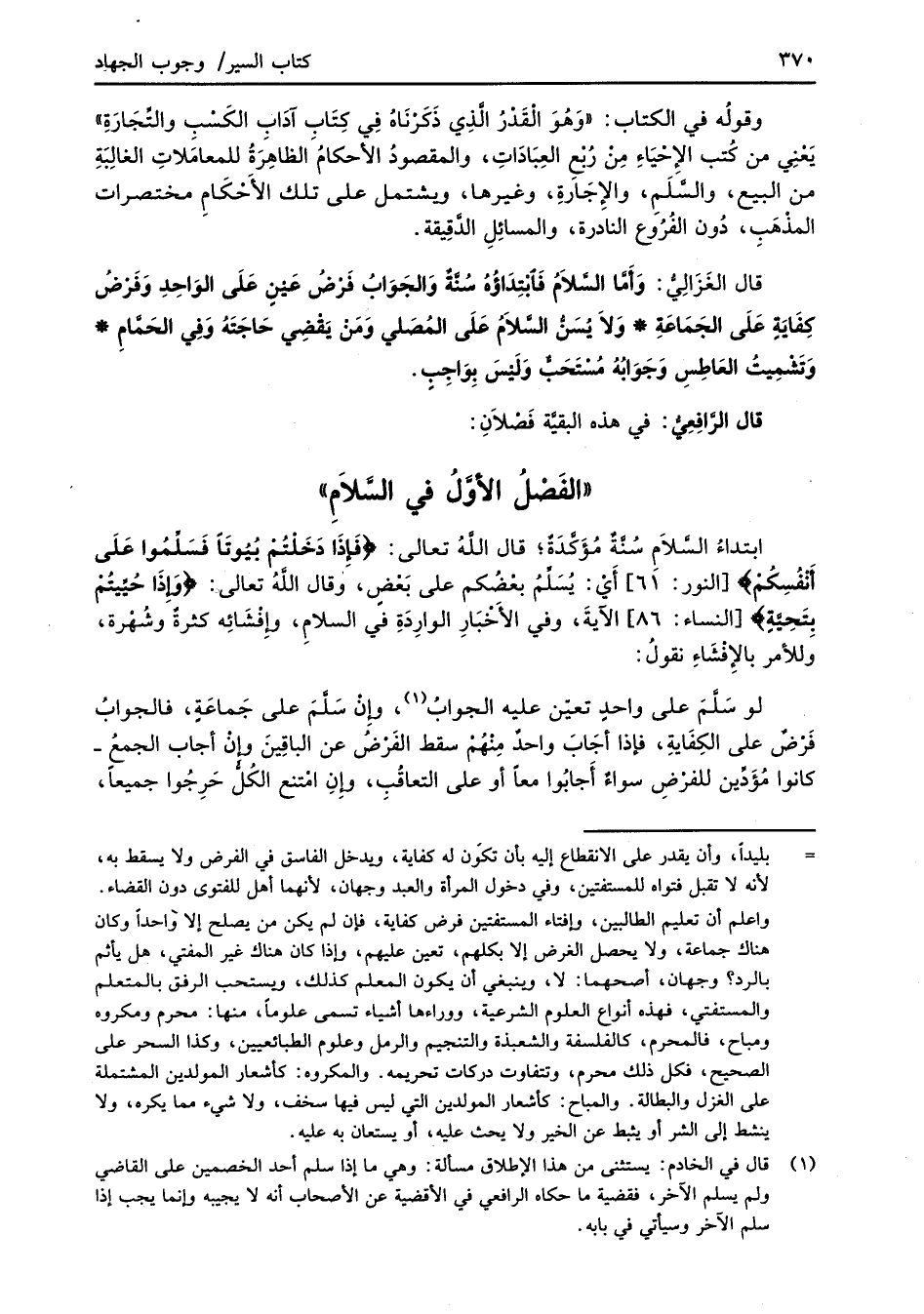 قال الغَزَالِيُّ: وَأمَّا السَّلاَمُ فَابْتِدَاؤُهُ سُنَّةٌ والجَوَابُ فَرْضُ عَيْنٍ عَلَى الوَاحِدِ وَفرْضُ كِفَايَةِ عَلَى الجَمَاعَةِ* وَلاَ يُسَنُّ السَّلاَمُ عَلَى المُصَلي وَمَنْ يَقْضِي حاجَتَهُ وَفِي الحَمَّامِ* وَتَشْمِيتُ العاطِسِ وَجَوَابُهُ مُسْتَحَبٌّ وَلَيْسَ بِوَاجِبٍ.