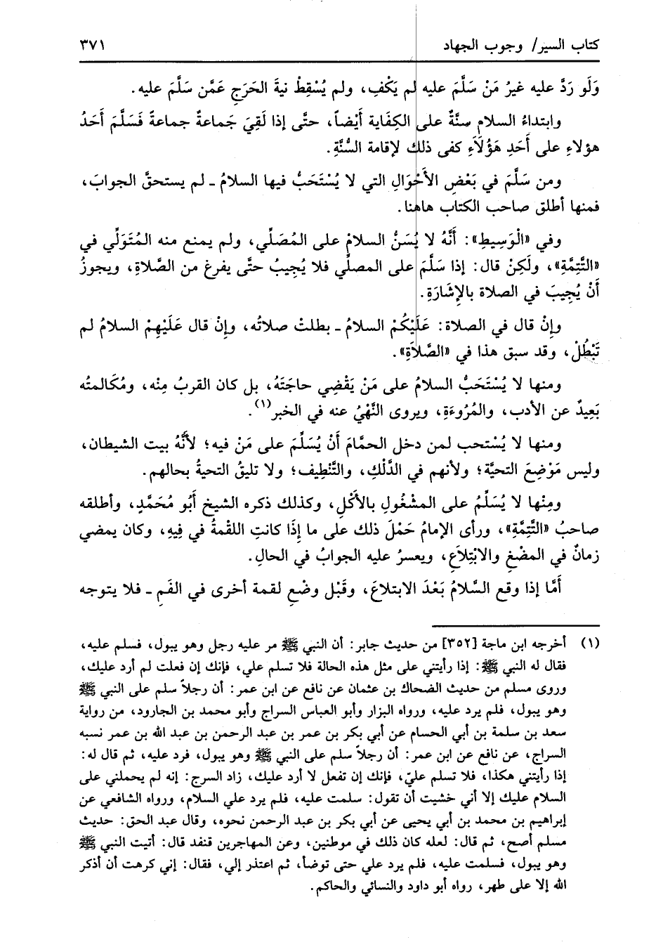 (¬1) أخرجه ابن ماجة [352] من حديث جابر: أن النبي -صلى الله عليه وسلم- مر عليه رجل وهو يبول، فسلم عليه، فقال له النبي-صلى الله عليه وسلم-: إذا رأيتني على مثل هذه الحالة فلا تسلم علي، فإنك إن فعلت لم أرد عليك، وروى مسلم من حديث الضحاك بن عثمان عن نافع عن ابن عمر: أن رجلاً سلم على النبي -صلى الله عليه وسلم- وهو يبول، فلم يرد عليه، ورواه البزار وأبو العباس السراج وأبو محمد بن الجارود، من رواية سعد بن سلمة بن أبي الحسام عن أبي بكر بن عمر بن عبد الرحمن بن عبد الله بن عمر نسبه السراج، عن نافع عن ابن عمر: أن رجلاً سلم على النبي -صلى الله عليه وسلم- وهو يبول، فرد عليه، ثم قال له: إذا رأيتني هكذا، فلا تسلم عليّ، فإنك إن تفعل لا أرد عليك، زاد السرج: إنه لم يحملني على السلام عليك إلا أني خشيت أن تقول: سلمت عليه، فلم يرد علي السلام، ورواه الشافعي عن إبراهيم بن محمد بن أبي يحيى عن أبي بكر بن عبد الرحمن نحوه، وقال عبد الحق: حديث مسلم أصح، ثم قال: لعله كان ذلك في موطنين، وعن المهاجرين قنفد قال: أتيت النبي -صلى الله عليه وسلم- وهو يبول، فسلمت عليه، فلم يرد علي حتى توضأ، ثم اعتذر إلي، فقال: إني كرهت أن أذكر الله إلا على طهر، رواه أبو داود والنسائي والحاكم.