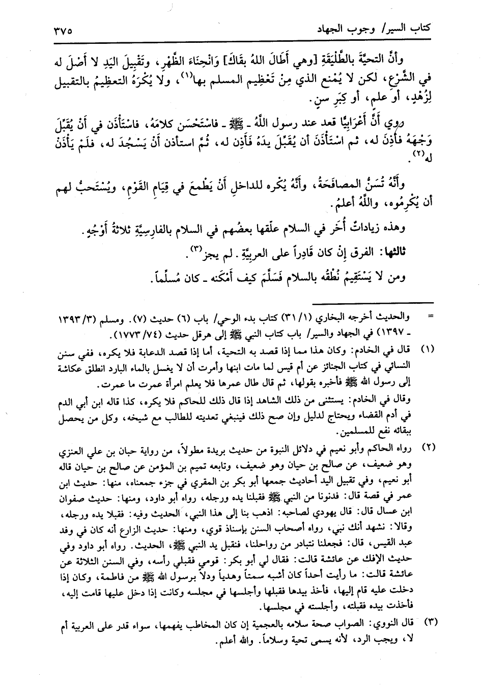 (¬3) قال النووي: الصواب صحة سلامه بالعجمية إن كان المخاطب يفهمها، سواء قدر على العربية أم لا، ويجب الرد, لأنه يسمى تحية وسلاماً. والله أعلم.