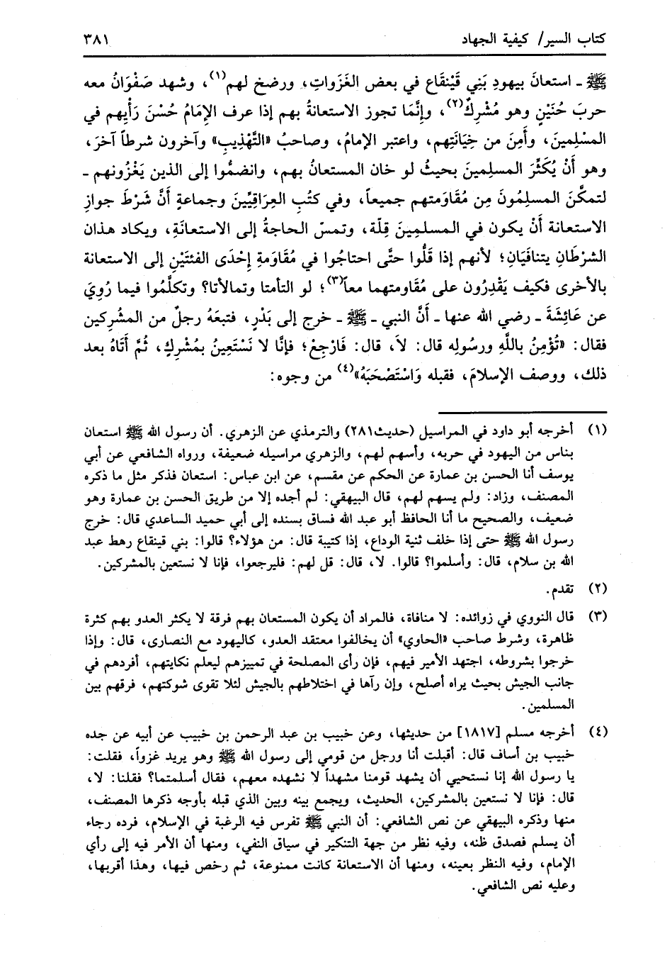 (¬1) أخرجه أبو داود في المراسيل (حديث 281) والترمذي عن الزهري. أن رسول الله -صلى الله عليه وسلم- استعان بناس من اليهود في حربه، وأسهم لهم، والزهري مراسيله ضعيفة، ورواه الشافعي عن أبي يوسف أنا الحسن بن عمارة عن الحكم عن مقسم، عن ابن عباس: استعان فذكر مثل ما ذكره المصنف، وزاد: ولم يسهم لهم، قال البيهقي: لم أجده إلا من طريق الحسن بن عمارة وهو ضعيف، والصحيح ما أنا الحافظ أبو عبد الله فساق بسنده إلى أبي حميد الساعدي قال: خرج رسول الله -صلى الله عليه وسلم- حتى إذا خلف ثنية الوداع، إذا كتيبة قال: من هؤلاء؟ قالوا: بني قينقاع رهط عبد الله بن سلام، قال: وأسلموا؟ قالوا. لا، قال: قل لهم: فليرجعوا، فإنا لا نستعين بالمشركين.