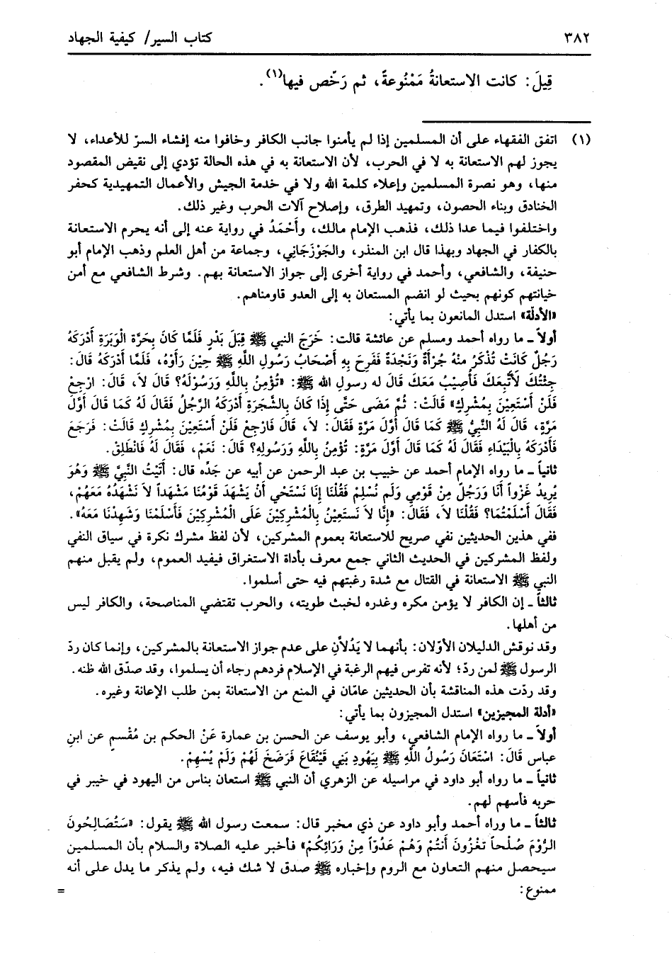 أولاً- ما رواه أحمد ومسلم عن عائشة قالت: خَرَجَ النبي -صلى الله عليه وسلم- قِبَلَ بدْرٍ فَلمَّا كَانَ بِحَرَّة الْوَبَرَةِ أدْرَكَهُ رَجُلٌ كَانَت تُذْكَرُ منْهُ جُرْأَةٌ وَنَجْدَةٌ فَفَرِحَ بِهِ أصْحَابُ رَسُولِ اللهِ -صلى الله عليه وسلم- حِيْنَ رَأوْهُ، فَلَمَّا أدْرَكَهُ قَالَ: جِئْتُكَ لَأَتَّبِعَكَ فَأُصِيْبُ مَعَكَ قَالَ له رسولِ الله -صلى الله عليه وسلم-: "تُؤْمِنُ باللهِ وَرَسُوْلَه؟ قَالَ لاَ، قَالَ: ارْجِعْ فَلَنْ أَسْتَعِيْنَ بِمُشْرِكٍ" قَالَتْ: ثُمَّ مَضَى حَتَّى إِذَا كَانَ بالشَّجَرَةِ أدْرَكَهُ الرَّجُلُ فَقَالَ لَهُ كَمَا قَالَ أوَّلَ مَرَّةٍ، قَالَ لَهُ النَّبِيُّ -صلى الله عليه وسلم- كَمَا قَالَ أَوَّلَ مرَّةٍ فَقَالَ: لاَ، قَالَ فَارْجِعْ فَلَنْ أَسْتَعِيْنَ بِمُشْرِكٍ قَالَتْ: فَرَجَعَ فَأَدْرَكَهُ بِالْبَيْدَاءِ فَقَالَ لَهُ كَمَا قَالَ أَوَّلَ مَرَّةٍ: تُؤْمِنُ بِاللهِ وَرَسُولِه؟ قَالَ: نَعَمْ، فَقَالَ لَهُ فَانْطَلِقْ.