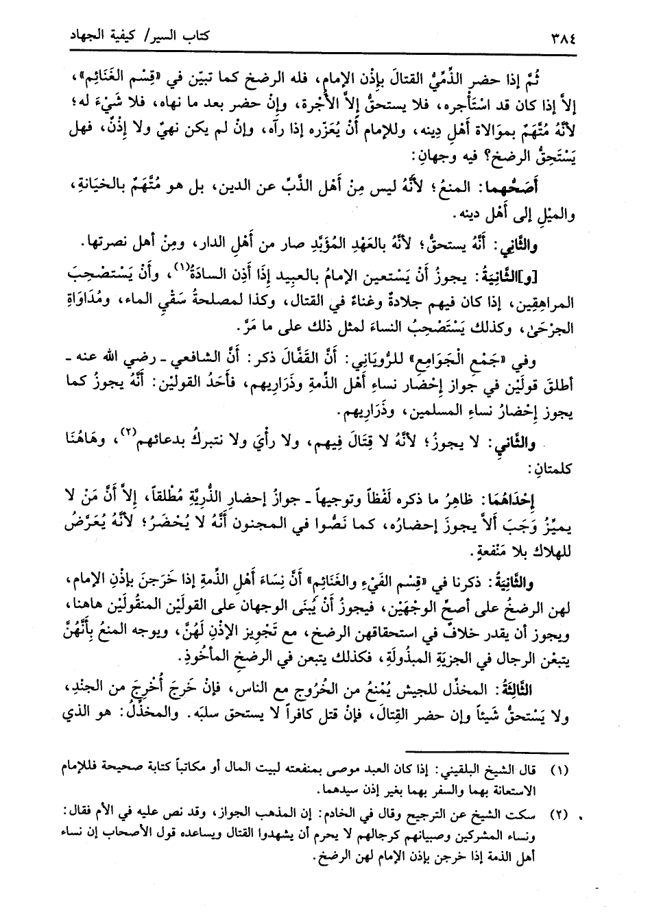 (¬2) سكت الشيخ عن الترجيح وقال في الخادم: إن المذهب الجواز، وقد نص عليه في الأم فقال: ونساء المشركين وصبيانهم كرجالهم لا يحرم أن يشهدوا القتال ويساعده قول الأصحاب إن نساء أهل الذمة إذا خرجن بإذن الإِمام لهن الرضخ.