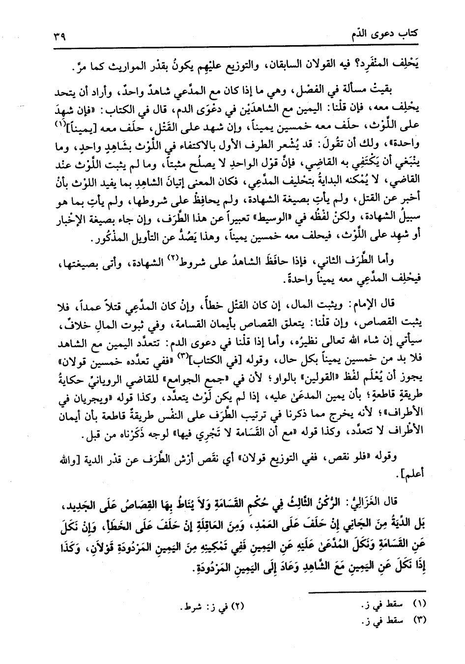 قال الغَزَالِيُّ: الرُّكْنُ الثَّالِثُ فِي حُكْمِ القَسَامَةِ وَلا يُنَاطُ بِهَا القِصَاصُ عَلَى الجَدِيد، بَل الدِّيَةُ مِنَ الجَانِي إنْ حَلَفَ عَلَى العَمْدِ، وَمِنَ العَاقِلَةِ إنْ حَلَفَ عَلَى الخَطَأِ، وَإِنْ نَكَلَ عَنِ القَسَامَةِ وَنَكَلَ المُدَّعَى عَلَيْهِ عَنِ اليَمِينِ فَفِي تَمْكِينِهِ مِنَ اليَمِينِ المَرْدُودَةِ قَوْلاَنِ، وَكَذَا إِذَا نَكَلَ عَنِ اليَمِينِ مَعَ الشَّاهِدِ وَعَادَ إِلَى اليَمِينِ المَرْدُودَةِ.