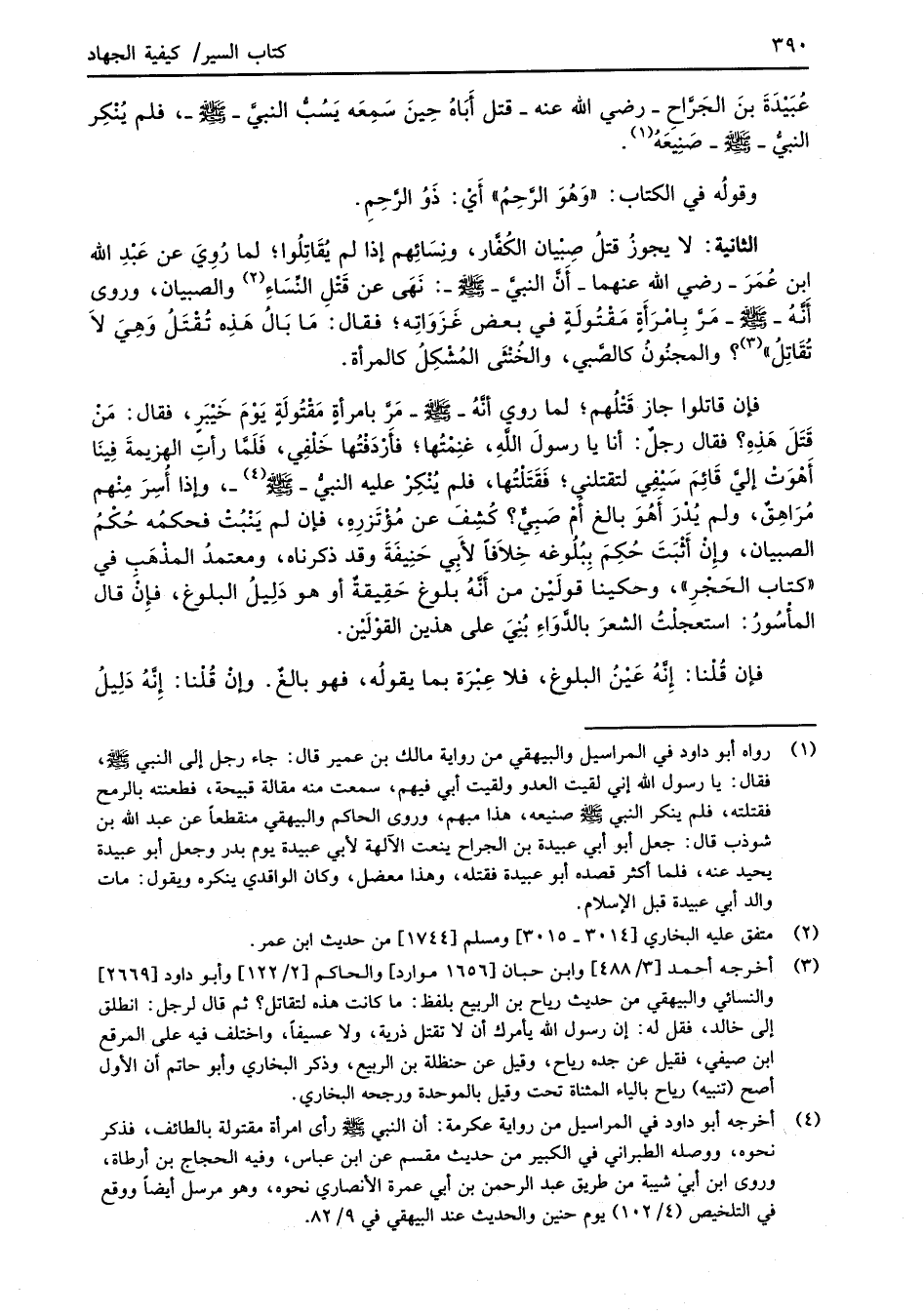 الثانية: لا يجوزُ قتلُ صِبْيان الكُفَّار، ونِسَائِهم إذا لم يُقَاتِلُوا؛ لما رُوِيَ عن عَبْدِ الله ابن عُمَرَ -رضي الله عنهما- أَنَّ النبيَّ -صلى الله عليه وسلم-: نَهَى عن قَتْلِ النِّسَاءِ (¬2) والصبيان، وروى أَنَّه -صلى الله عليه وسلم- مَرَّ بِامْرَأَةٍ مَقْتُولَةٍ في بعض غَزَوَاتِه؛ فقال: مَا بَالُ هَذِه تُقْتَلُ وَهِيَ لاَ تُقَاتِلُ" (¬3)؟ والمجنُونُ كالصَّبي، والخُنْثَى المُشْكِلُ كالمرأة.