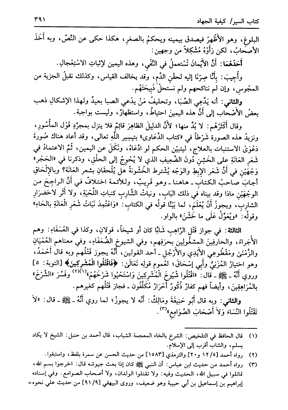 (¬3) رواه أحمد من حديث ابن عباس: أن النبي -صلى الله عليه وسلم- كان إذا بعث جيوشه قال: اخرجوا بسم الله، قاتلوا في سبيل الله، الحديث وفيه: ولا تقتلوا الولدان، ولا أصحاب الصوامع. وفي إسناده إبراهيم بن إسماعيل بن أبي حبيبة وهو ضعيف، وروى البيهقي [9/ 91] من حديث علي نحوه =