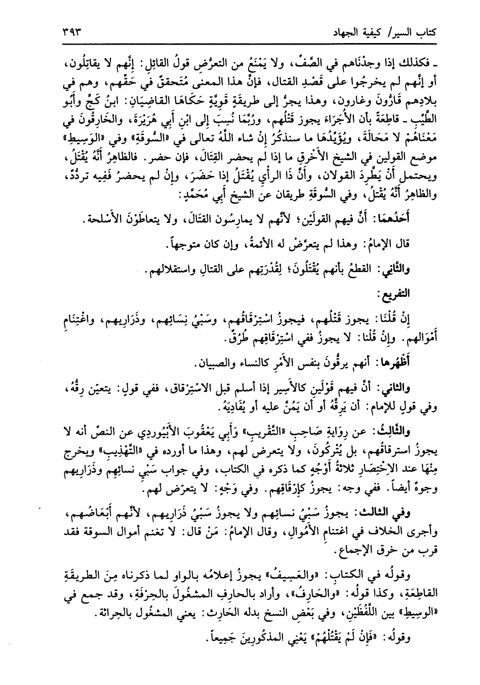 وفي الثالث: يجوزُ سَبْيُ نسائِهم ولا يجوزُ سَبْيُ ذَرَارِيهم؛ لأنَّهم أَبْعَاضُهم، وأجرى الخلاف في اغتنامِ الأَمُوالِ، وقال الإمامُ: مَنْ قال: لا تغنم أموال السوقة فقد قرب من خرق الإجماع.