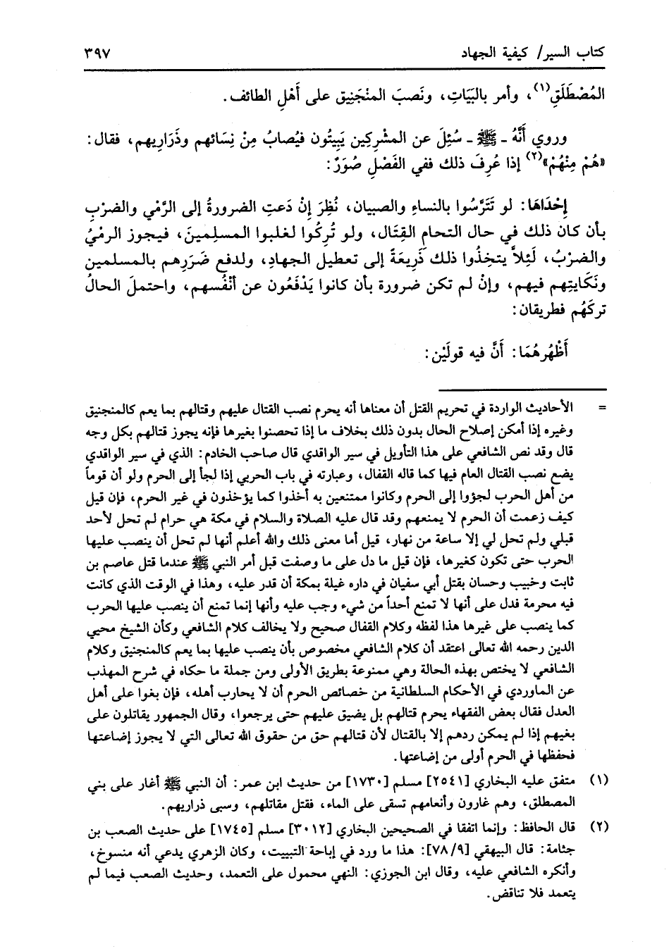 (¬2) قال الحافظ: وإنما اتفقا في الصحيحين البخاري [3012] مسلم [1745] على حديث الصعب بن جثامة: قال البيهقي [9/ 78]: هذا ما ورد في إباحة التبييت، وكان الزهري يدعي أنه منسوخ، وأنكره الشَّافعي عليه، وقال ابن الجوزي: النهي محمول على التعمد، وحديث الصعب فيما لم يتعمد فلا تناقض.