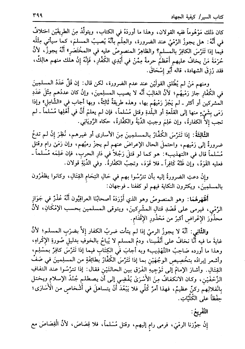 والثَّانِي: أنَّهُ لا يجوزُ الرميُ إذا لم يتأت ضربُ الكفار إِلاَّ بضرْبِ المسلم؛ لأنَّ غايةَ ما فيه أنَّا نخافُ على أَنْفُسِنا، ودمُ المسلمِ لا يُباحُ بالخوفِ بدليلَ صُورةِ الإِكْراهِ، وهذا ما أورده صَاحِبُ "التَّهْذِيب" وبه أجابَ في الكِتَاب فيما إذا تَتَرَّسَ كافِرٌ بمسْلِم، وأشعر إيرادُه بتخْصِيصِ الوجْهَيْنِ بما إذا تَتَرَّسَ الكُفَّارُ بَطائِفَةٍ من المسلِمينَ في صَفِّ القِتَالِ. وأشارَ الإمامُ إلى تَوْجِيهِ الفَرْق بين الحالتَيْنِ فقال: إذا تترَّسُوا عند التفافِ الزَّحْفَيْنِ، وكان الانكفاف مِنَ الأَسْرَى يُفْضِيِ إلى أن يصطلمِ جُنْدُ الإِسلام ويختل بانْفلالِهم ركنٌ عظيمٌ، فهذا أمرٌ كُلِّي فلا يَبْعُدَ أنْ يتساهلَ في أشْخاصٍ من الأسَارَى؛ حَفْظًا على الكُلِّيَّاتِ.