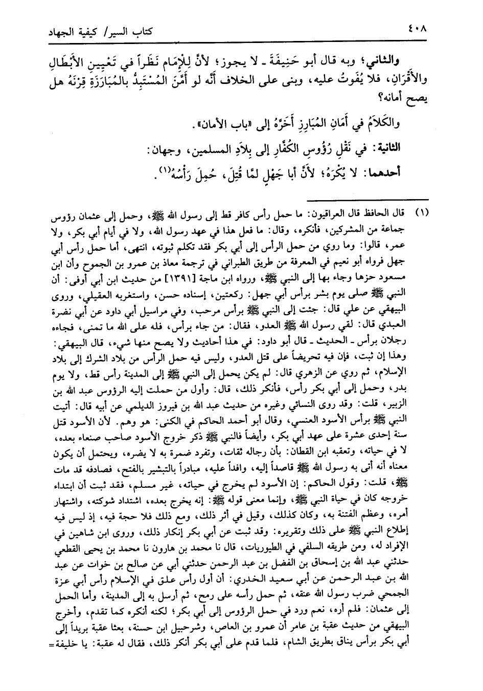 (¬1) قال الحافظ قال العراقيون: ما حمل رأس كافر قط إلى رسول الله -صلى الله عليه وسلم-، وحمل إلى عثمان رؤوس جماعة من المشركين، فأنكره، وقال: ما فعل هذا في عهد رسول الله، ولا في أيام أبي بكر، ولا عمر، قالوا: وما روي من حمل الرأس إلى أبي بكر فقد تكلم ثبوته، انتهى، أما حمل رأس أبي جهل فرواه أبو نعيم في المعرفة من طريق الطبراني في ترجمة معاذ بن عمرو بن الجموح وأن ابن مسعود حزها وجاء بها إلى النبي -صلى الله عليه وسلم-، ورواه ابن ماجة [1391] من حديث ابن أبي أوفى: أن النبي -صلى الله عليه وسلم- صلى يوم بشر برأس أبي جهل: ركعتين، إسناده حسن، واستغربه العقيلي، وروى البيهقي عن علي قال: جئت إلى النبي -صلى الله عليه وسلم- برأس مرحب، وفي مراسيل أبي داود عن أبي نضرة العبدي قال: لقي رسول الله -صلى الله عليه وسلم- العدو، فقال: من جاء برأس، فله على الله ما تمنى، فجاءه رجلان برأس -الحديث- قال أبو داود: في هذا أحاديث ولا يصح منها شيء، قال البيهقي: وهذا إن ثبت، فان فيه تحريضًا على قتل العدو، وليس فيه حمل الرأس من بلاد الشرك إلى بلاد الإِسلام، ثم روي عن الزهريّ قال: لم يكن يحمل إلى النبي -صلى الله عليه وسلم- إلى المدينة رأس قط، ولا يوم بدر، وحمل إلى أبي بكر رأس، فأنكر ذلك، قال: وأول من حملت إليه الرؤوس عبد الله بن الزبير، قلت: وقد روى النسائي وغيره من حديث عبد الله بن فيروز الديلمي عن أبيه قال: أتيت النبي -صلى الله عليه وسلم- برأس الأسود العنسي، وقال أبو أحمد الحاكم في الكنى: هو وهم. لأن الأسود قتل سنة إحدى عشرة على عهد أبي بكر، وأيضاً فالنبي -صلى الله عليه وسلم- ذكر خروج الأسود صاحب صنعاء بعده، لا في حياته، وتعقبه ابن القطان: بأن رجاله ثقات، وتفرد ضمرة به لا يضره، ويحتمل أن يكون معناه أنه أتى به رسول الله -صلى الله عليه وسلم- قاصدًا إليه، وافدًا عليه، مبادرًا بالتبشير بالفتح، فصادفه قد مات -صلى الله عليه وسلم-، قلت: وقول الحاكم: إن الأسود لم يخرج في حياته، غير مسلم، فقد ثبت أن ابتداء خروجه كان في حياة النبي -صلى الله عليه وسلم-، وإنما معنى قوله -صلى الله عليه وسلم-: إنه يخرج بعده، اشتداد شوكته، واشتهار أمره، وعظم الفتنة به، وكان كذلك، وقيل في أثر ذلك، ومع ذلك فلا حجة فيه، إذ ليس فيه إطلاع النبي -صلى الله عليه وسلم- على ذلك وتقريره: وقد ثبت عن أبي بكر إنكار ذلك، وروى ابن شاهين في الإفراد له، ومن طريقه السلفي في الطيوريات، قال نا محمد بن هارون نا محمد بن يحيى القطعي حدثني عبد الله بن إسحاق بن الفضل بن عبد الرحمن حدثني أبي عن صالح بن خوات عن عبد الله بن عبد الرحمن عن أبي سعيد الخدري: أن أول رأس علق في الإِسلام رأس أبي عزة الجمحي ضرب رسول الله عنقه، ثم حمل رأسه على رمح، ثم أرسل به إلى المدينة، وأما الحمل إلى عثمان: فلم أره، نعم ورد في حمل الرؤوس إلى أبي بكر؛ لكنه أنكره كما تقدم، وأخرج البيهقي من حديث عقبة بن عامر أن عمرو بن العاص، وشرحبيل ابن حسنة، بعثا عقبة بريدًا إلى أبي بكر برأس يناق بطريق الشام، فلما قدم على أبي بكر أنكر ذلك، فقال له عقبة: يا خليفة =