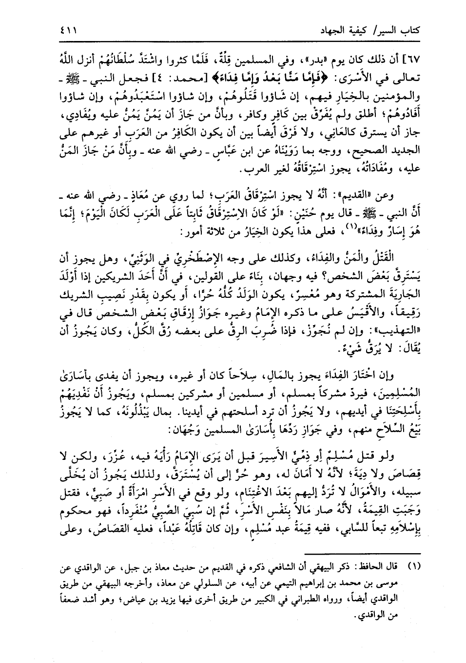ولو قتل مُسْلِمٌ أِو ذِمِّيٌّ الأسِيرَ قبل أن يَرَى الإِمَامُ رَأْيَهُ فيه، عُزِّرَ، ولكن لا قِصَاصَ ولا دِيَةَ؛ لأنَّهُ لا أَمَانَ له، وهو حُرٌّ إلى أن يُسْتَرَقَّ، ولذلك يَجُوزُ أن يُخَلَّى سبيله، والأَمْوَالُ لا تُرَدُّ إليهم بَعْدَ الاغْتِنَام، ولو وقع في الأسْرِ امْرَأَةٌ أو صَبِيٌّ، فقتل وَجَبَتِ القِيمَةُ، لأَنَّهُ صار مَالاً بِنَفْسِ الأَسْرِ، ثُمَّ إن سُبِيَ الصَّبيُّ مُنْفَرِدًا، فهو محكوم بِإِسْلاَمِهِ تبعاً للسَّابي، ففيه قِيمَةُ عبد مُسْلِمٍ، وإن كان قَاتِلُهُ عَبْدًا، فعليه القصَاصُ، وعلى