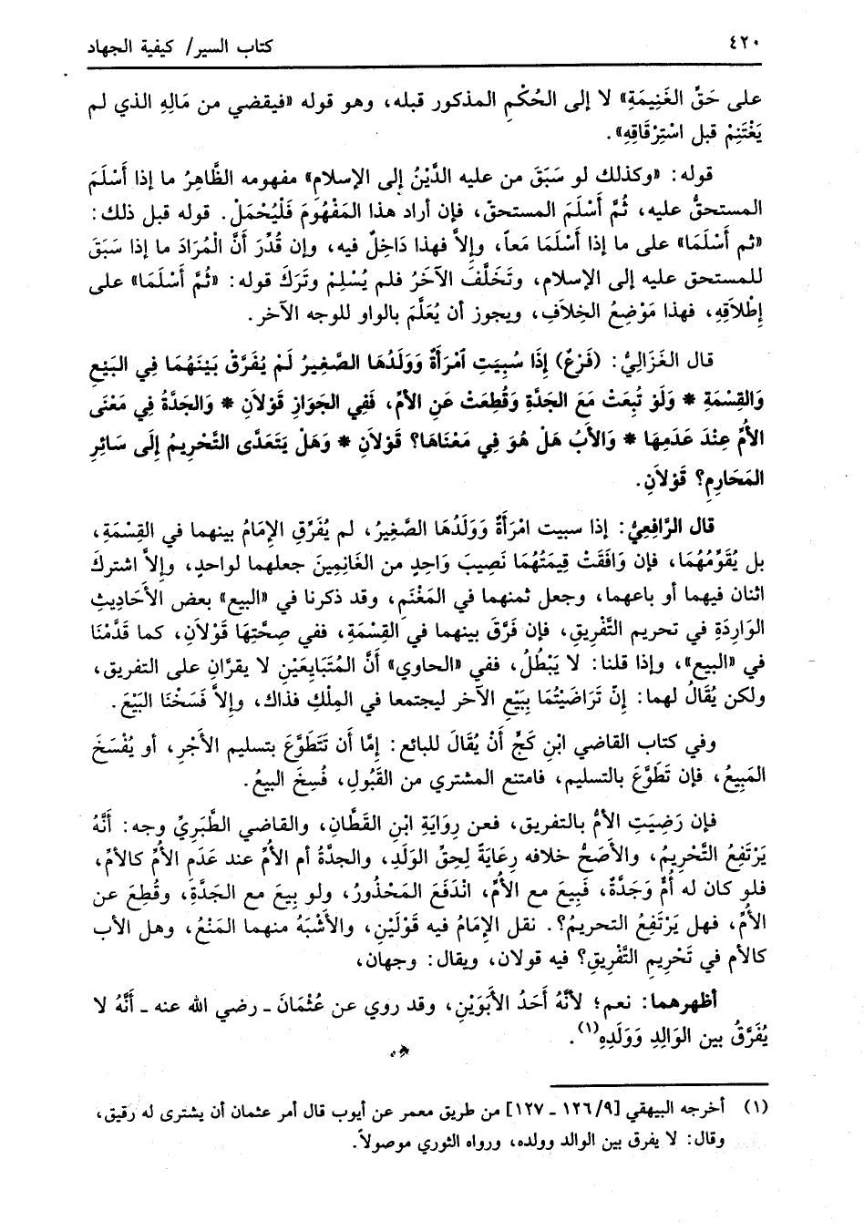 قال الغَزَالِيُّ: (فَرْعٌ) إِذَا سُبِيَتِ امْرَأَةٌ وَوَلَدُهَا الصَّغِيرُ لَمْ يُفَرَّقْ بَيْنَهُمَا فِي البَيْعِ وَالقِسْمَةِ* وَلَوْ تُبِعَتْ مَعَ الجَدَّةِ وَقُطِعَتْ عَنِ الأمِّ، فَفِي الجَوَازِ قَوْلاَنِ* وَالجَدَّةُ فِي مَعْنَى الأُمِّ عِنْدَ عَدَمِهَا* وَالأَبُ هَلْ هُوَ فِي مَعْنَاهَا؟ قَوْلاَنِ* وَهَلْ يَتَعَدَّى التَّحْرِيمُ إِلَى سَائِرِ المَحَارِمِ؟ قَوْلاَنِ.