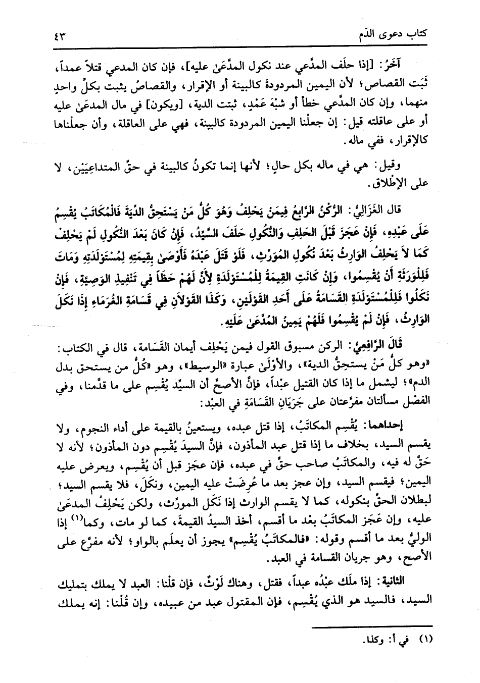 قال الغَزَالِيُّ: الرُّكْنُ الرَّابعُ فِيمَنْ يَحْلِفُ وَهُوَ كُلُّ مَنْ يَسْتَحِقُّ الدِّيَةَ فَالْمُكَاتَبُ يُقْسِمُ عَلَى عَبْدِهِ، فَإنْ عَجَزَ قَبْلَ الحَلِفِ والنُّكُولِ حَلَفَ السَّيِّدُ، فَإنْ كَانَ بَعْدَ النُّكُولِ لَمْ يَحْلِفْ كَمَا لا يَحْلِفُ الوَارِث بَعْدَ نُكُولِ المُوَرِّثِ، فَلَوْ قَتَلَ عَبْدَهُ فأَوْصَى بِقِيمَتِهِ لِمُسْتَوْلَدَتِهِ وَمَاتَ فَلِلْوَرَثَةِ أَنْ يُقْسِمُوا، وَإِنْ كَانَتِ القِيمَةُ لِلْمُسْتَوْلَدَةِ لأَنَّ لَهُمْ حَظَاً فِي تَنْفِيذِ الوَصِيَّةِ، فَإِنْ نَكَلُوا فَلِلْمُسْتَوْلَدَةِ القَسَامَة عَلَى أَحَدِ القَوْلَيْنِ، وَكَذَا القَوْلاَنِ فِي قَسَامَةِ الغُرَمَاءِ إِذَا نَكَلَ الوَارِثُ، فَإنْ لَمْ يُقْسِمُوا فَلَهُمْ يَمِينُ المُدَّعَى عَلَيْهِ.