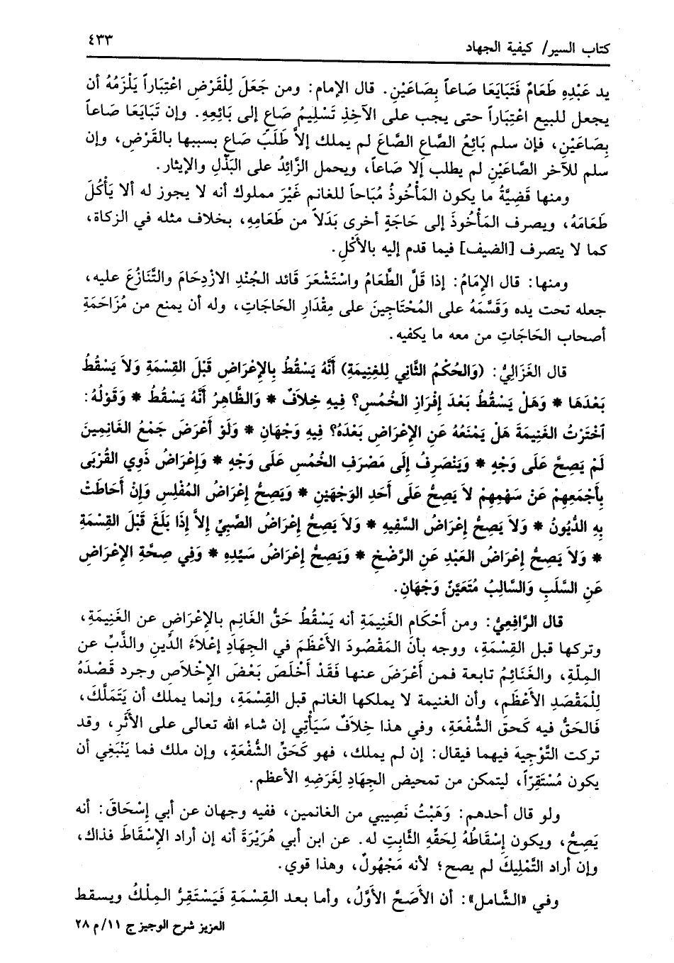 قال الغَزَالِيُّ: (وَالحُكْمُ الثَّانِي لِلغِنِيمَةِ) أنَّهُ يَسْقُطُ بِالإِعْرَاضِ قَبْلَ القِسْمَةِ وَلاَ يَسْقُطُ بَعْدَهَا* وَهَلْ يَسْقُطُ بَعْدَ إِقْرَار الخُمُسِ؟ فِيهِ خِلاَفٌ* وَالظَّاهِرُ أنَّهُ يَسْقُطُ* وَقَوْلُهُ: اخْتَرْتُ الغَنِيمَةَ هَلْ يَمْنَعهُ عَنِ الإعْرَاضِ بَعدَهُ؟ فِيهِ وَجْهَانِ* وَلَوْ أَعْرَضَ جَمْعُ الغَانِمِينَ لَمْ يَصِحَّ عَلَى وَجْهٍ* وَيَنْصَرِفُ إِلَى مَصْرَفِ الخُمُسِ عَلَى وَجْهٍ* وَإعْرَاضُ ذَوِي القُرْبَى بِأجْمَعِهِمْ عَنْ سَهْمِهِمْ لاَ يَصِحُّ علَى أَحَدِ الوَجْهَيْنِ* وَيَصِحُّ إِعْرَاضُ المُفْلِسِ وَإنْ أَحَاطَتْ بِهِ الدُّيُون* وَلاَ يَصِحُّ إِعْرَاضُ السَّفِيهِ* وَلاَ يَصِحُّ إِعْرَاضُ الصَّبِيِّ إلاَّ إِذَا بَلَغَ قَبْلَ القِسْمَةِ* وَلاَ يَصِحُّ إِعْرَاض العَبْدِ عَنِ الرَّضْخِ* وَيصِحُّ إِعْرَاضُ سَيِّدِهِ* وَفِي صِحَّةِ الإعْرَاضِ عَنِ السَّلَبِ وَالسَّالِبُ مُتَعَيَّنٌ وَجْهَانِ.
