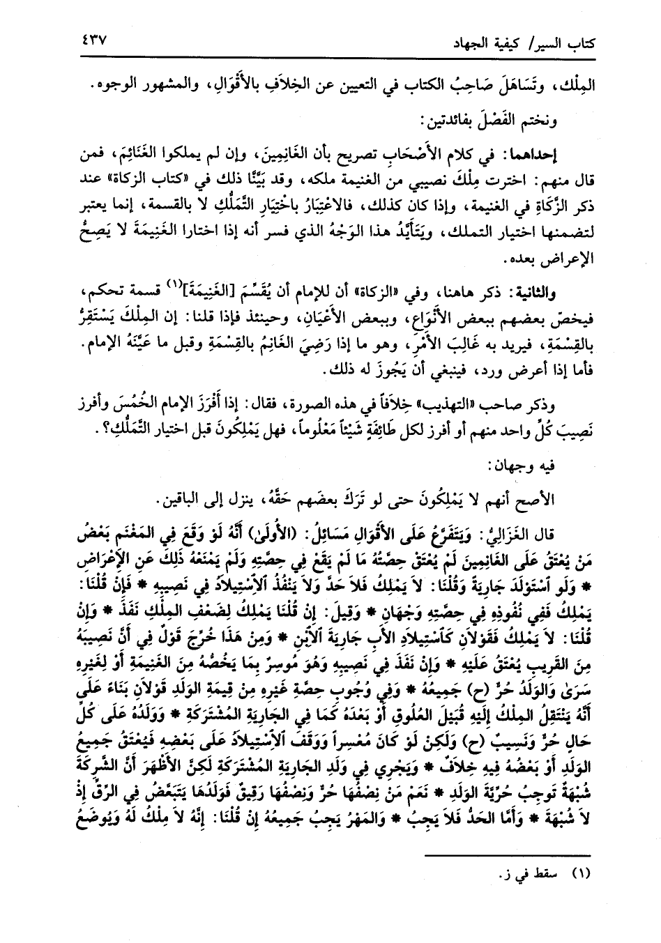 قال الغَزَالِيُّ: وَيَتَفَرَّعُ عَلَى الأَقْوَالِ مَسَائِلُ: (الأُولَى) أنَّهُ لَوْ وَقَعَ في المَغْنَم بَعْضُ مَنْ يُعْتَقُ عَلَى الغَانِمِينَ لَمْ يُعْتَقْ حِصَّتُهُ مَا لَمْ يَقَعْ فِي حِصَّتِهِ وَلَمْ يَمْنَعْهُ ذَلِكَ عَنِ الإعْرَاضِ* وَلَو اسْتَوْلَدَ جَارِيةً وَقُلْنَا: لاَ يَمْلِكُ فَلاَ حَدَّ وَلاَ يَنْفُذُ الاِسْتِيلادُ فِي نَصِيبِهِ* فَإنْ قُلْنَا: يَمْلِكُ فَفِي نُفُوذِهِ فِي حِصَّتِهِ وَجْهَانِ* وَقِيلَ: إنْ قُلْنَا يَمْلِكُ لِضَعْفِ المِلْكِ نَفَذَ* وَإنْ قُلْنَا: لاَ يَمْلِكُ فَقَوْلاَنِ كَاسْتِيلاَدِ الأَبِ جَاريةَ الابْنِ* وَمِنْ هَذَا خُرِّجَ قَوْلٌ فِي أَنَّ نَصِيبَهُ مِنَ القَرِيب يُعْتَقُ عَلَيْهِ* وَإِنْ نَفَذَ فِي نَصِيبِهِ وَهُوَ مُوسِرٌ بِمَا يَخُصُّهُ مِنَ الغَنِيمَةِ أَوْ لِغَيْرِهِ سَرَى وَالوَلَدُ حُرٌّ (ح) جَمِيعُهُ* وَفِي وُجُوب حِصَّةِ غَيْرِهِ مِنْ قِيمَةِ الوَلَدِ قَوْلاَنِ بَنَاءً عَلَى أنَّهُ يَنْتَقِلُ المِلْكُ إِلَيْهِ قُبَيْلَ العُلُوقِ أو بَعْدَهُ كَمَا فِي الجَارَيةِ المُشْتَرَكَةِ* وَوَلَدُهُ عَلَى كُلِّ حَالٍ حُرٌّ وَنَسِيبٌ (ح) وَلَكِنْ لَوْ كَانَ مُعْسِرًا وَوَقَفَ الاسْتِيْلاَدُ عَلَى بَعْضِهِ فَيُعْتَقُ جَمِيعُ الوَلَدِ أَوْ بَعْضُهُ فيهِ خِلاَفٌ* وَيَجْرِي فِي وَلَدِ الجَارِيَةِ المُشْتَرَكةِ لَكِنَّ الأَظْهَرَ أَنَّ الشَّركَةَ شُبْهَةٌ تَوجِبُ حُرِّيَّةَ الوَلَدِ* نَعَمْ مَنْ نِصْفُهَا حُرٌّ وَنصْفُهَا رَقِيقٌ فَوَلَدُهَا يَتَبَعَّضُ فِي الرِّقِّ إِذْ لاَ شُبْهَةَ* وَأَمَّا الحَدُّ فَلاَ يَجِبُ* وَالمَهْرُ يَجِبُ جَمِيعهُ إِنْ قُلْنَا: إنَّهُ لاَ مِلْكُ لَهُ وَيُوضَعُ