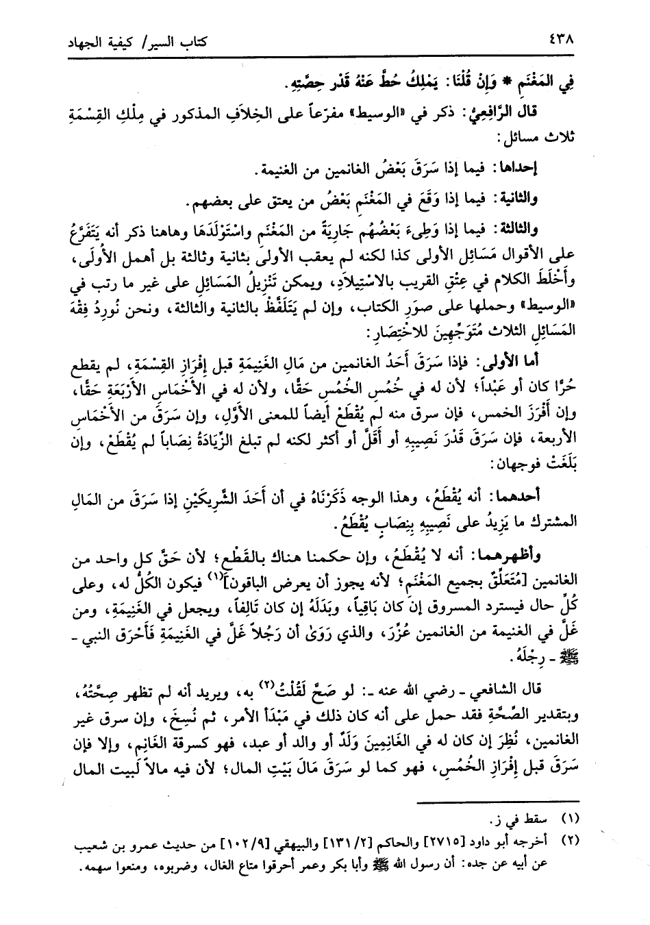 أما الأولى: فإذا سَرَقَ أحَدُ الغانمين من مَالِ الغَنِيمَةِ قبل إفْرَازِ القِسْمَةِ، لم يقطع حُرًّا كان أو عَبْدًا؛ لأن له في خُمُسِ الخُمُسِ حَقًّا, ولأن له في الأَخْمَاسِ الأَرْبَعَةِ حَقًّا، وإن أَفْرَزَ الخمس، فإن سرق منه لم يُقْطَعْ أيضاً للمعنى الأَوَّلِ، وإن سَرَقَ من الأَخْمَاسِ الأربعة، فإن سَرَقَ قَدْرَ نَصِيبِهِ أو أَقَلَّ أو أكثر لكنه لم تبلغ الزِّيَادَةُ نِصَاباً لم يُقْطَعْ، وإن بَلَغَتْ فوجهان: