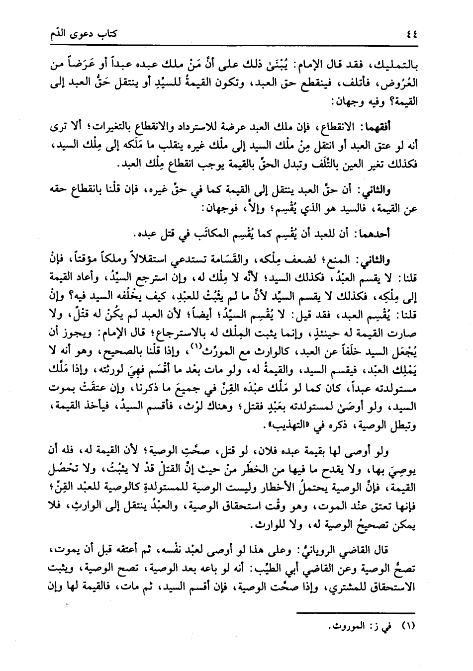 والثاني: المنع؛ لضعف مِلْكه، والقَسَامة تستدعي استقلالاً وملكاً مؤقتاً، فإنْ قلنا: لا يقسم العبْدُ، فكذلك السيد؛ لأنَّه لا مِلْك له، وإن استرجع السيِّدُ، وأعاد القيمة إلى مِلْكِه، فكذلك لا يقسم السيِّد لأنَّ ما لم يثْبُتْ للعبْدِ، كيف يخْلُفه السيد فيه؟ وإنْ قلنا: يُقْسِم العبد، فقد قيل: لا يُقْسِم السيِّدُ؛ أيضًا؛ لأن العبد لم يكُنْ له قتْلٌ، ولا صارت القيمة له حينئذٍ، وإنما يثبت المِلْك له بالاسترجاع؛ قال الإِمام: ويجوز أن يُجعَل السيد خلَفاً عن العبد، كالوارث مع المورِّث (¬1)، وإذا قلْنا بالصحيح، وهو أنه لا يَمْلِك العبْد، فيقسم السيد، والقيمةُ له، ولو مات بعْد ما أقْسَم فهِيَ لورثته، وإذا مَلَّك مستولدته عبدًا، كان كما لو مَلَّك عبْدَه القِنَّ في جميعَ ما ذكرنا، وإن عتقَتْ بموت السيد، ولو أوصَى لمستولدته بعَبْدٍ فقتل؛ وهناك لوْث، فأقسم السيدُ، فيأخذ القيمة، وتبطل الوصية، ذكره في "التهذيب".