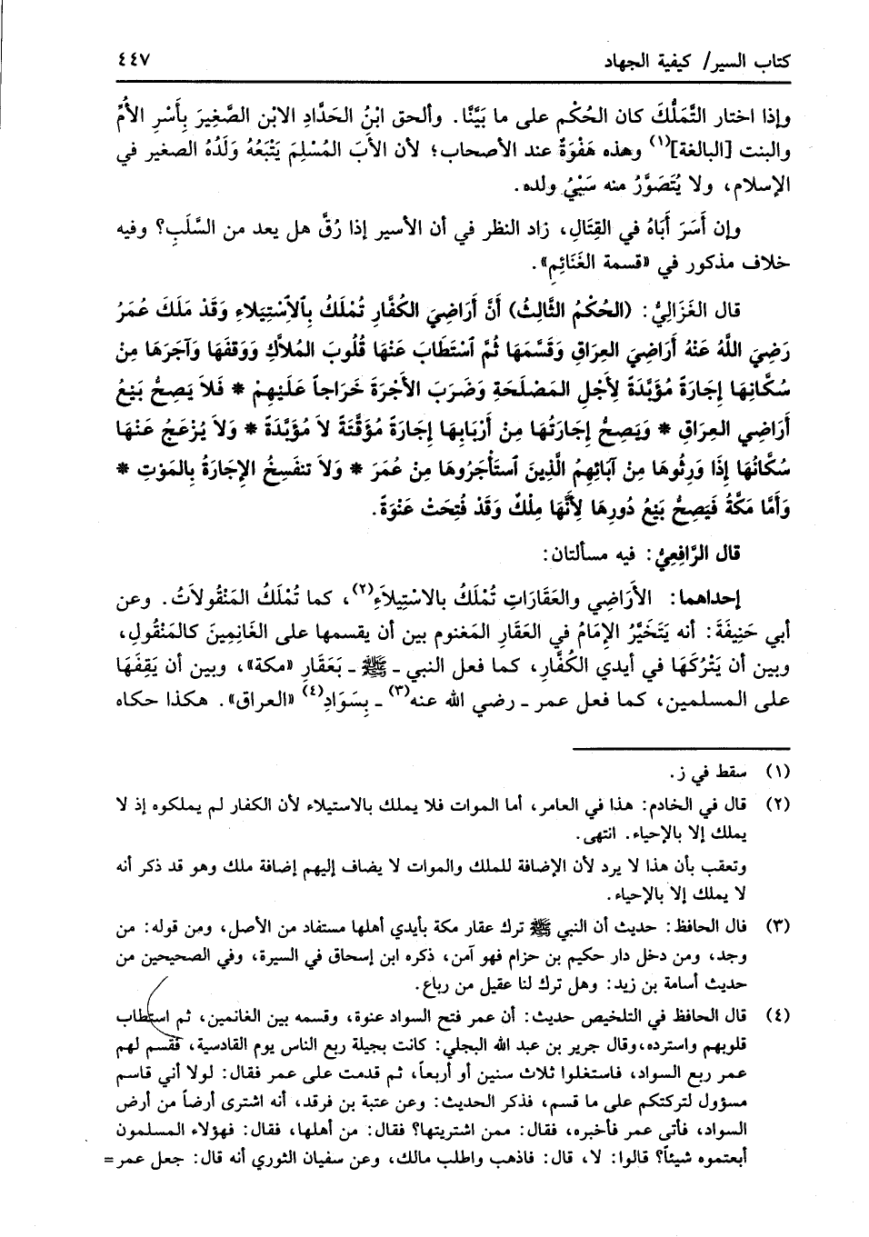قال الغَزَالِيُّ: (الحُكْمُ الثَّالِثُ) أَنَّ أَرَاضِيَ الكُفَّارِ تُمْلَكُ بِالاِسْتِيَلاءِ وَقَدْ مَلَكَ عُمَرُ رَضِيَ اللَّهُ عَنْهُ أَرَاضِيَ العِرَاقِ وَقَسَّمَهَا ثُمَّ اسْتَطَابَ عَنْهَا قُلُوبَ المُلاَّكِ وَوَقفَهَا وَآجَرَهَا مِنْ سُكَّانِهَا إجَارَةً مُؤَبَّدَةً لِأَجْلِ المَصْلَحَةِ وَضَرَبَ الأَجْرَةَ خَرَاجًا عَلَيْهِمْ* فَلاَ يَصِحُّ بَيْعُ أَرَاضِي العِرَاقِ* وَيَصِحُّ إِجَارَتُهَا مِنْ أَرْبَابِهَا إِجَارَةً مُؤَقَّتَةَ لاَ مؤَبَّدَةً* وَلاَ يُزْعَجُ عَنْهَا سُكَّانُهَا إِذَا وَرِثُوهَا مِنْ آبَائِهِمُ الَّذِينَ اسْتَأْجَرُوهَا مِنْ عُمَرَ* وَلاَ تنفَسِخُ الإجَارَةُ بِالمَوْتِ* وَأَمَّا مَكَّةُ فَيَصِحُّ بَيْعُ دُورِهَا لِأَنَّهَا مِلْكٌ وَقَدْ فُتِحَتْ عَنْوَةً.