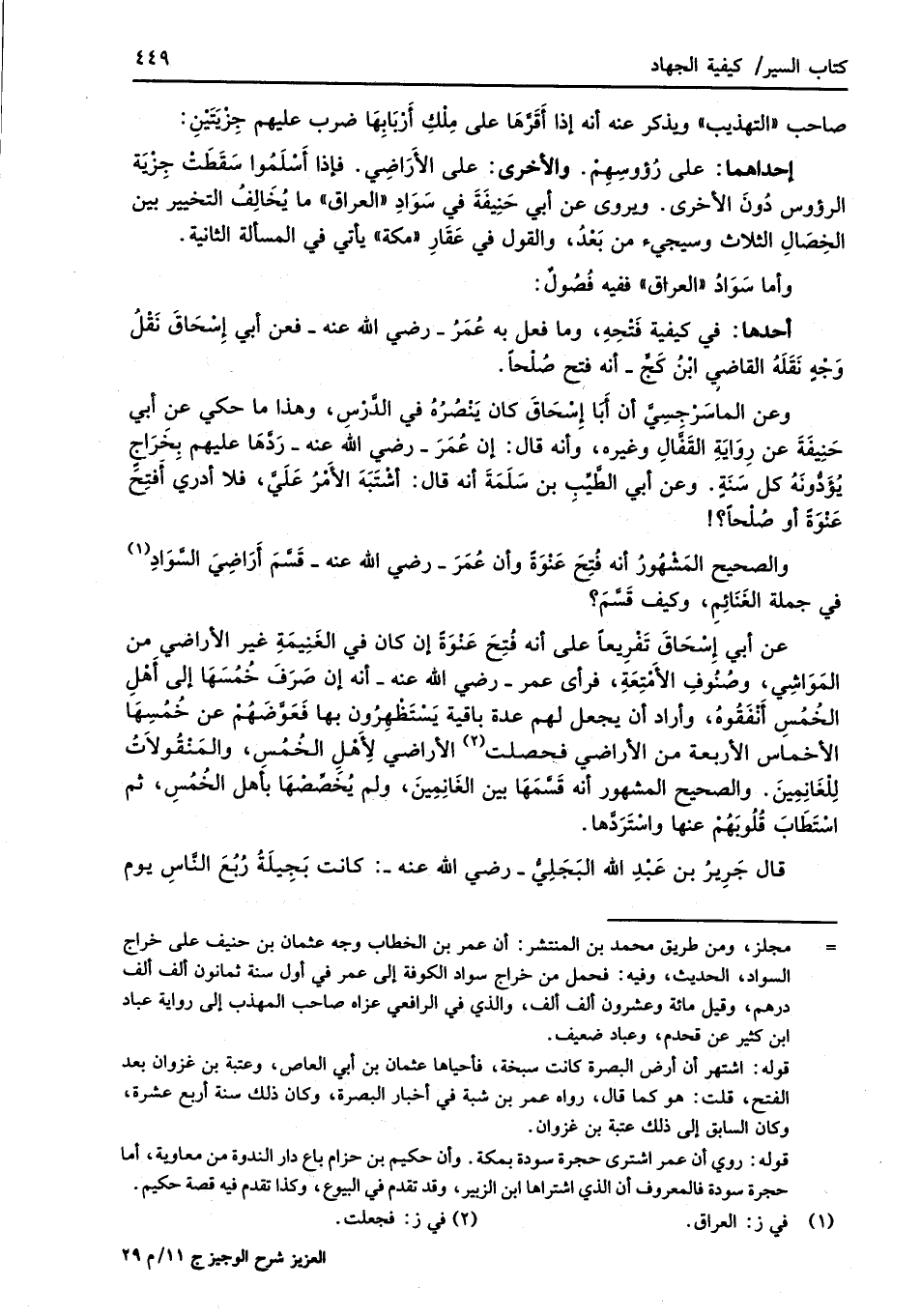 والصحيح المَشْهُورُ أنه فُتِحَ عَنْوَةً وأن عُمَرَ -رضي الله عنه- قَسَّمَ أَرَاضِيَ السَّوَادِ (¬1) في جملة الغَنَائِمِ، وكيف قَسَّمَ؟