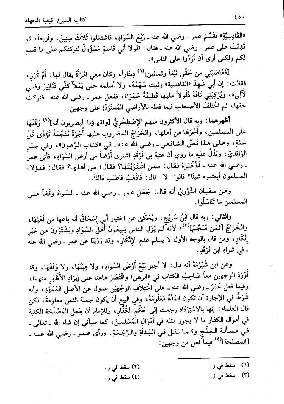 وعن سفيان الثَّوْرِيُّ أنه قال: جَعَل عمر -رضي الله عنه- السَّوَادَ وَقْفًا على المسلمين ما تَنَاسَلُوا.