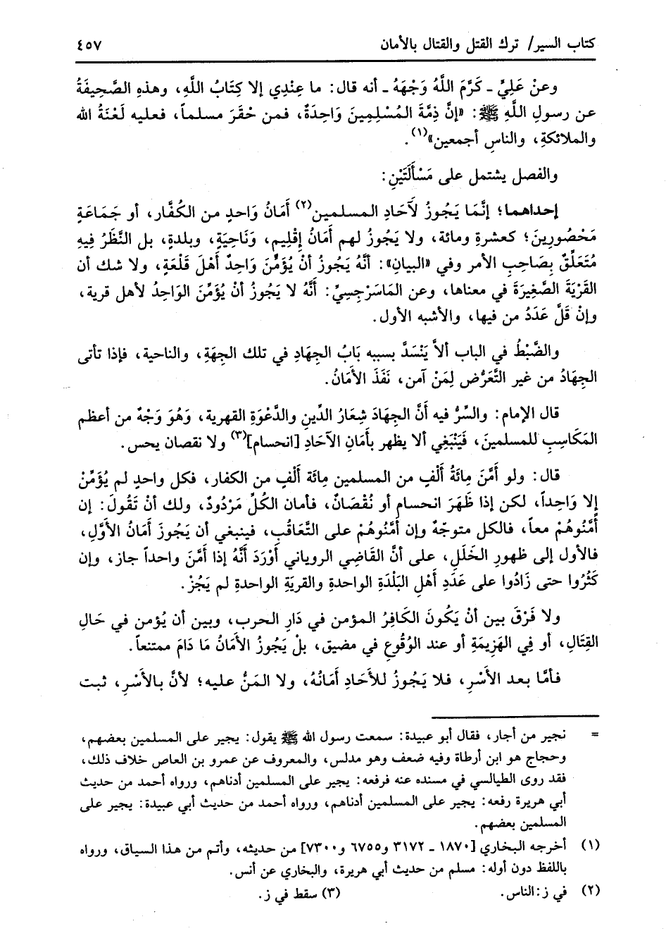 وعنْ عَلِيٍّ -كَرَّمَ اللهُ وَجْهَهُ- أنه قال: ما عِنْدِي إلا كِتَابُ اللهِ، وهذهِ الصَّحِيفَة عن رسولِ الله -صلى الله عليه وسلم-: "إنَّ ذِمَّةَ المُسْلِمِينَ وَاحِدَةٌ، فمن حقَرَ مسلماً، فعليه لَعْنَةُ الله والملائكةِ، والناسِ أجمعين" (¬1).