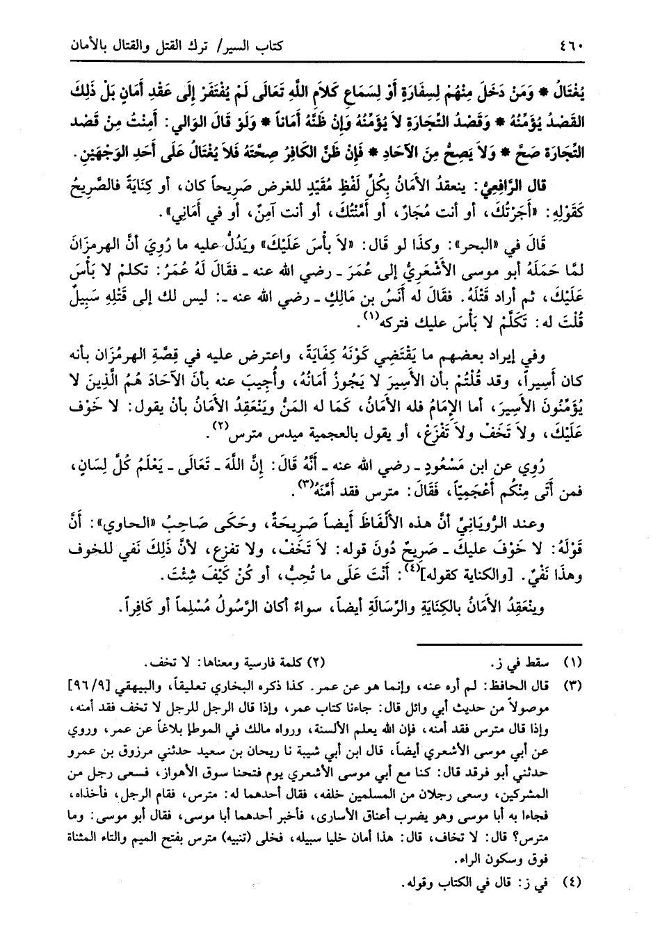 وفي إيراد بعضهم ما يَقْتَضِي كَوْنَهُ كِفَايَةً، واعترض عليه في قِصَّةِ الهرمُزَان بأنه كان أَسِيرًا، وقد قُلْتُمْ بأن الأَسِيرَ لا يَجُوزُ أَمَانُهُ، وأُجِيبَ عنه بأنَ الآحَادَ هُمُ الَّذِينَ لا يُؤَمِّنُونَ الأَسِيرَ، أما الإمَامُ فله الأَمَانُ، كَمَا له المَنُّ ويَنْعَقِدُ الأَمَانُ بأنْ يقول: لا خَوْف عَلَيْكَ، ولاَ تَخَفْ وَلا تَفْزَعْ، أو يقول بالعجمية ميدس مترس (¬2).