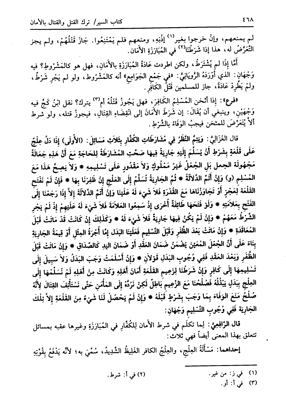 قال الغَزَالِيُّ: وَيتِمُّ النَّظَرُ فِي مُشَارَطَاتِ الكُفَّارِ بِثَلاَثِ مَسَائِلَ: (الأُولَى) إِذَا دَلَّ عِلْجٌ عَلَى قَلْعَةٍ بِشَرْطِ أَنْ يُسَلِّمَ إِلَيْهِ جَارِيَةً فِيهَا صَحَّتِ المُشَارَطَة لِلحَاجَةِ مَعَ أَنَّ هَذِهِ جَعَالَةٌ مَجْهُولَة الجعل بَلِ الجُعْلُ غَيْرُ مَمْلُوكٍ وَلاَ مَقْدُورٍ عَلَى تَسْلِيمِهِ* وَلاَ يَصِحُّ هَذَا مَعَ المُسْلِمِ (و) وَإنْ أتَمَّ الدَّلالَةُ* ثُمَّ الجَارِيَةُ تُسَلَّمُ إِلَى العَلْجِ إِنْ ظَفِرْنَا بِهَا* فَإِنْ لَمْ نَفْتَحِ القَلْعَة لِعَجْزٍ أَوْ تَجَاوَزْنَاهَا مَعَ القُدْرَةِ فَلاَ شَيْءَ لَهُ عَلَيْنَا وَإِنْ أَتَمَّ الدَّلالَةَ إِلاَّ إِذَا رَجَعْنَا إِلَى الفَتْحِ بِعَلاَمَتِهِ* وَلَوْ فَتَحَهَا طَائِفَةٌ أُخْرَى إِذْ سَمِعُوا العَلاَمَةَ فَلاَ شَيْءَ لَهُ عَلَيْهِمْ إِذْ لَمْ يَجْرِ الشَّرْطُ مَعَهُمْ* وَإِنْ لَمْ يَكُنْ فِيهَا جَارِيةٌ فَلاَ شَيْءَ لَهُ* وَكَذلِكَ إِنْ كَانَتْ قَدْ مَاتَتْ قَبْلَ المُعَاقَدَةِ* وَإِنْ مَاتَتْ بَعْدَ الظَّفَرِ وَقَبْلَ التَّسْلِيمِ فَعَلَيْنَا البَدَل إِمَّا أُجْرَةُ المِثْلِ أَوْ قِيمَةُ الجَارِيَةِ بِنَاءً عَلَى أَنَّ الجُعْلَ المُعَيَّنَ يُضْمَنُ ضَمَانَ العَقْدِ أَوْ ضَمَانَ اليَدِ كَالصَّدَاقِ* وَإنْ مَاتَتْ قَبْلَ الظَّفَرِ وَبَعْدَ العَقْدِ فَفِي وُجُوبِ البَدَلِ قَوْلاَنِ* وَإِنْ أَسْلَمَتْ وَجَبَ البَدَلُ وَلاَ سَبِيلَ إِلَى تَسْلِيمِهَا إِلَى كَافِرٍ وَإِنْ شَرَطْنَا لِزَعِيمِ القَلْعَةِ أَمَانَ أهْلِهِ وَكَانَتْ مِنْ أَهْلِهِ لَمْ نُسَلِّمْهَا إِلَى العِلْجِ بِبَدَلٍ يَبْذُلُهُ فَصُلْحُنَا مَعَ الزَّعِيمِ بَاطِلٌ لَكِنْ نَرُدُّهُ إِلَى المَأْمَنِ حَتَّى نَسْتَأْنِفَ القِتَالَ لأنَّهُ صُلْحٌ مَنَعَ الوَفَاءَ بِمَا وَجَبَ بِشَرْطٍ قَبْلَهُ* وَإِنْ لَمْ يَحْصُلْ لَنَا شَيْءٌ مِنَ القَلْعَةِ إِلاَّ تِلْكَ الجَارِيَة فَفِي وُجُوبِ التَّسْلِيمِ وَجْهَانِ: