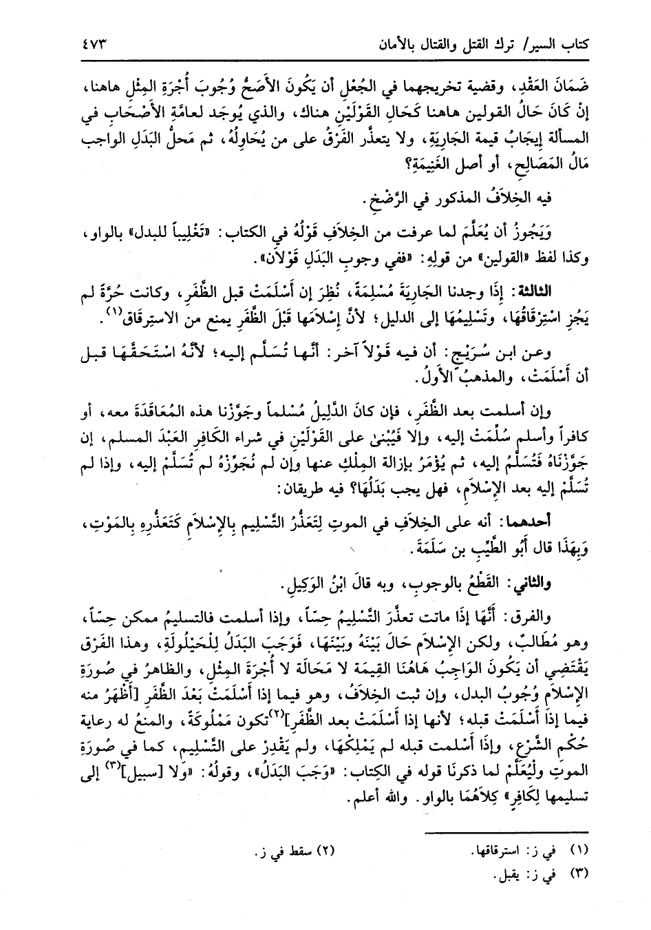 والفرق: أَنَّهَا إذَا ماتت تعذَّرَ التَّسْلِيمُ حِسّاً، وإذا أسلمت فالتسليمُ ممكن حِسّاً، وهو مُطَالبٌ، ولكن الإِسْلاَم حَالَ بَيْنَهُ وبَيْنَهَا، فَوَجَبَ البَدَلُ لِلْحَيْلُولَةِ، وهذا الفَرْق يَقْتَضِي أن يَكُونَ الوَاجِبُ هَاهُنَا القِيمَة لا مَحَالَة لا أُجْرَةَ المِثْلِ، والظاهرُ في صُورَةِ الإسْلاَمِ وُجُوبُ البدل، وإن ثبت الخِلاَف، وهو فيما إذا أَسْلَمَتْ بَعْدَ الظَّفَرِ [أَظْهَرُ منه فيما إذا أسْلَمَتْ قبله؛ لأنها إذا أَسْلَمَتْ بعد الظَّفَرِ] (¬2) تكون مَمْلُوكَةً، والمنعُ له رعاية حُكْمِ الشَّرْع، وإذَا أَسْلمت قبله لم يَمْلِكْهَا, ولم يَقْدِرْ على التَّسْلِيمِ، كما في صُورَةِ الموتِ ولْيُعَلَّمْ لما ذكرنَا قوله في الكِتاب: "وَجَبَ البَدَلُ"، وقولُهُ: "ولا [سبيل] (¬3) إلى تسليمها لِكَافِرٍ" كِلاَهُمَا بالواو. والله أعلم.