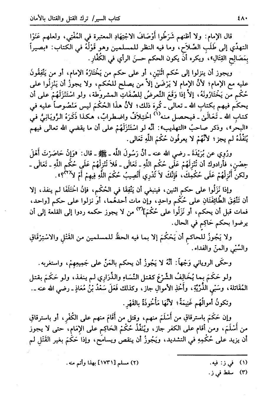قال الإِمام: ولا أظنهم شَرَطُوا أوْصَافَ الاجْتِهَادِ المعتبرة في المُفْتي، ولعلهم عَنَوْا التهدِّي إلى طَلَب الصَّلاحَ، وما فيه النظر للمسلمين وهو قَوْلهُ في الكتاب: "بصيراً بِمَصَالحِ القِتَالِ"، ويكره أن يكون الحكم حسنَ الرأي في الكُفَّارِ.