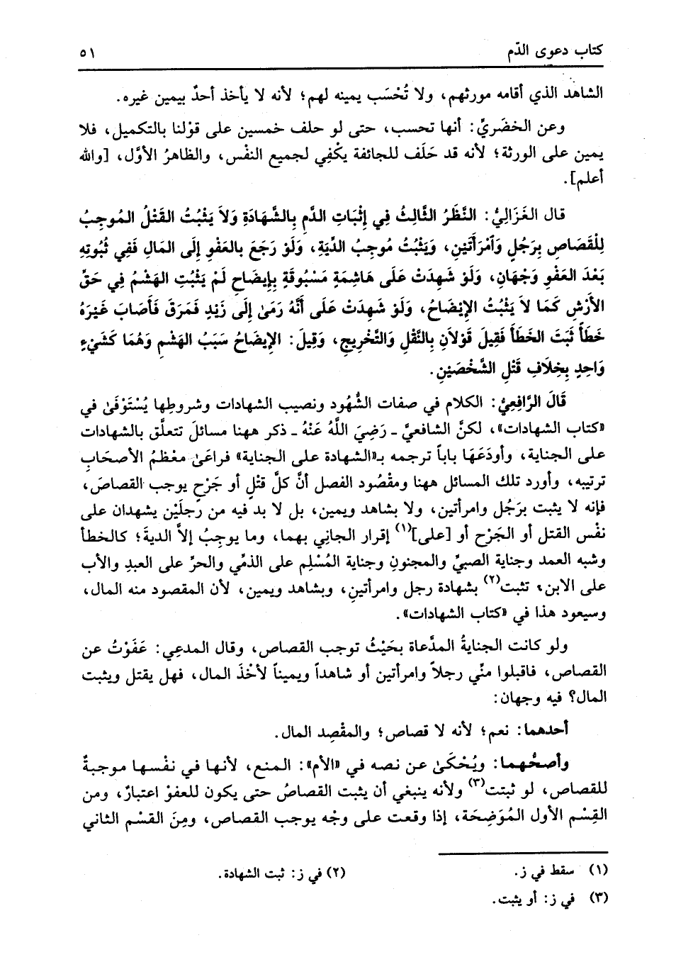 قال الغَزَالِيُّ: النَّظَرُ الثَّالِثُ فِي إِثْبَاتِ الدَّمِ بِالشَّهَادَةِ وَلاَ يَثْبُتُ القَتْلُ المُوجِبُ لِلْقَصَاصِ بِرَجُلٍ وامْرَأتَيْنِ، وَيَثْبُتُ مُوجِبُ الدِّيَةِ، وَلَوْ رَجَعَ بالعَفْوِ إِلَى المَالِ نَفِي ثُبُوتِهِ بَعْدَ العَفْوِ وَجْهَانِ، وَلَوْ شَهِدَتْ عَلَى هَاشِمَةٍ مَسْبُوقَةٍ بإِيضَاحِ لَمْ يَثْبُتِ الهَشْمُ فِي حَقِّ الأَرْشِ كَمَا لا يَثْبُتُ الإِيْضَاحُ، وَلوْ شَهِدَتْ عَلَى أنَّهُ رَمَى إِلَى زَيْدٍ فَمَرَقَ فَأَصَابَ غَيْرَهُ خَطَأً ثَبَتَ الخَطَأَ فَقِيلَ قَوْلاَنِ بِالنَّقْلِ والتَّخْرِيجِ، وَقِيلَ: الاِيضَاحُ سَبَبُ الهَشْمِ وَهُمَا كَشَيْءٍ وَاحِدٍ بِخِلاَفِ قَتْلِ الشَّخْصَيْنِ.