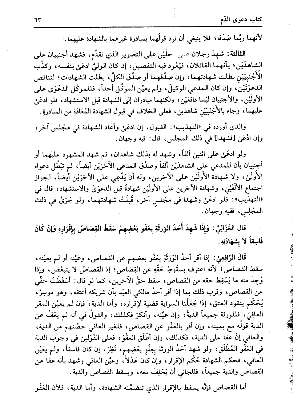 قال الْغَزَالِيُّ: وَإِذَا شَهِدَ أَحَدُ الوَرَثَةِ بِعَفْوِ بَعْضِهِمْ سَقَطَ القِصَاصُ بِإِقْرَارِهِ وَإِنْ كَانَ فَاسِقاً لاَ بِشَهَادَتِهِ.