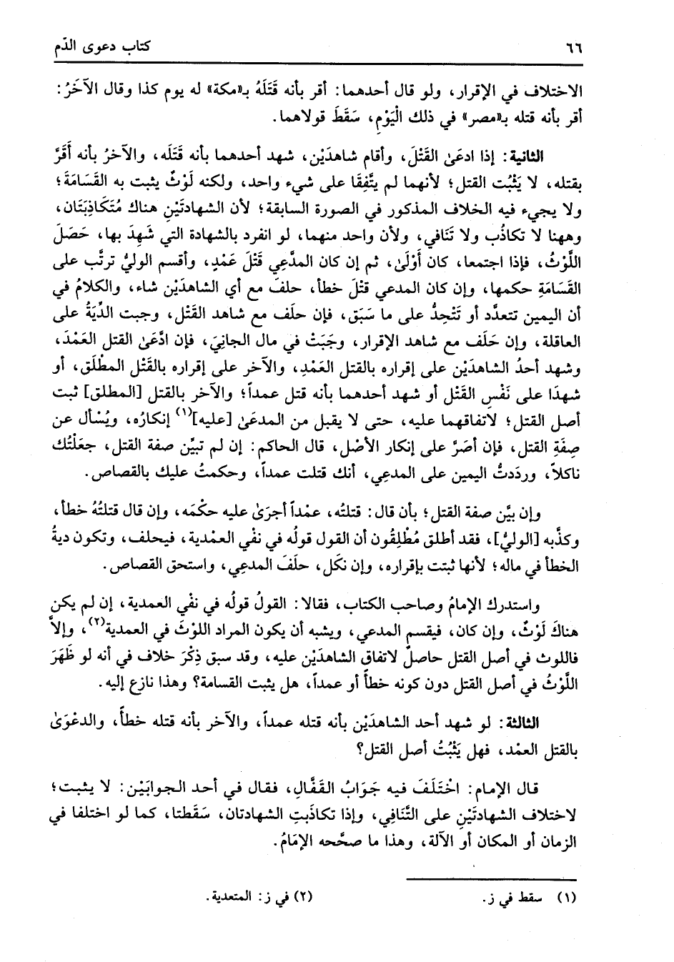 واستدرك الإمامُ وصاحب الكتاب، فقالا: القولُ قولُه في نفْي العمدية، إن لم يكن هناكَ لَوْثٌ، وإن كان، فيقسم المدعي، ويشبه أن يكون المراد اللوْثَ في العمدية (¬2)، وإلاَّ فاللوث في أصل القتل حاصلٌ لاتفاق الشاهدَيْن عليه، وقد سبق ذِكْرَ خلاف في أنه لو ظَهَرَ اللَّوْثُ في أصل القتل دون كونه خطأً أو عمداً، هل يثبت القسامة؟ وهذا نازع إليه.