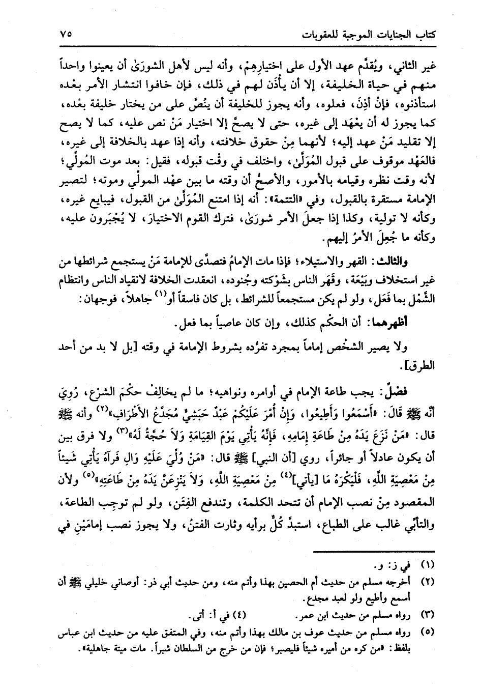 (¬5) رواه مسلم من حديث عوف بن مالك بهذا وأتم منه، وفي المتفق عليه من حديث ابن عباس بلفظ: "من كره من أميره شيئاً فليصبر؛ فإن من خرج من السلطان شبراً. مات ميتة جاهلية".