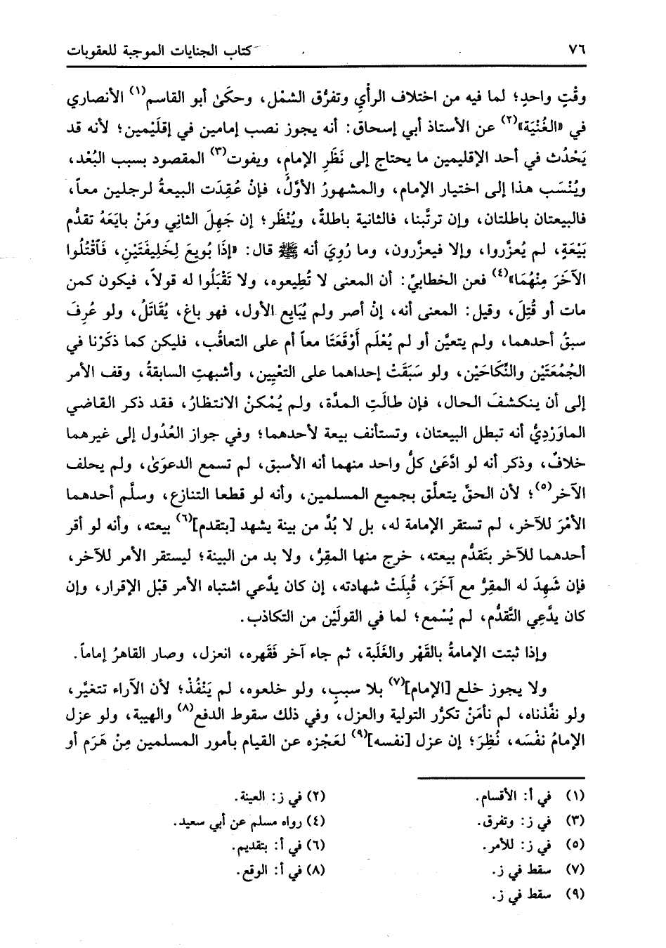 وقْتٍ واحدٍ؛ لما فيه من اختلاف الرأْيِ وتفرُّق الشمْل، وحكَى أبو القاسم (¬1) الأنصاري في "الغُنْيَة" (¬2) عن الأستاذ أبي إسحاق: أنه يجوز نصب إمامين في إقلَيميْن؛ لأنه قد يَحْدُث في أحد الإقليمين ما يحتاج إلى نَظَرِ الإمامِ، ويفوت (¬3) المقصود بسبب البُعْد، ويُنْسَب هذا إلى اختيار الإِمام، والمشهورُ الأوَّلُ، فإنْ عُقِدَت البيعةُ لرجلين معاً، فالبيعتان باطلتان، وإن ترتَّبنا، فالثانية باطلةٌ، ويُنْظَر؛ إن جَهِلَ الثانِي ومَنْ بايَعَهُ تقدُّم بَيعَةٍ، لم يُعزَّروا، وإلا فيعزَّرون، وما رُوِيَ أنه -صلى الله عليه وسلم- قال: "إذَا بُويعَ لِخَلِيفَتَيْنِ، فَاقْتُلُوا الآخَرَ مِنْهُمَا" (¬4) فعن الخطابيِّ: أن المعنى لا تُطِيعوه، ولا تَقْبَلُوا له قولاً، فيكون كمن مات أو قُتِلَ، وقيل: المعنى أنه، إنْ أصر ولم يُبَايع الأول، فهو باغ، يُقَاتَلُ، ولو عُرِفَ سبقُ أحدهما، ولم يتعيَّن أو لم يُعْلَم أَوْقَعَتَا معاً أم على التعاقُب، فليكن كما ذكَرْنا في الجُمُعَتَيْن والنِّكَاحَيْن، ولو سَبَقَتْ إحداهما على التعْيِين، وأشبهتِ السابقةُ، وقف الأمر إلى أن ينكشفَ الحال، فإن طالَتِ المدَّة، ولم يُمْكنْ الانتظارُ، فقد ذكر القاضي الماوَرْدِيُّ أنه تبطل البيعتان، وتستأنف بيعة لأحدهما؛ وفي جواز العُدُول إلى غيرهما خلافٌ، وذكر أنه لو ادَّعَى كلُّ واحد منهما أنه الأسبق، لم تسمع الدعوَى، ولم يحلف الآخر (¬5)؛ لأن الحقَّ يتعلَّق بجميع المسلمين، وأنه لو قطعا التنازع، وسلَّم أحدهما الأمْرَ للآخر، لم تستقر الإمامة له، بل لا بُدَّ من بينة يشهد [بتقدم] (¬6) بيعته، وأنه لو أقر أحدهما للآخر بتَقدُّم بيعته، خرج منها المقِرُّ، ولا بد من البينة؛ ليستقر الأمر للآخر، فإن شَهِدَ له المقِرُّ مع آخَرَ، قُبِلَتْ شهادته، إن كان يدَّعي اشتباه الأمر قبْل الإقرار، وإن كان يدَّعِي التَّقدُّم، لم يُسْمع؛ لما في القولَيْن من التكاذب.