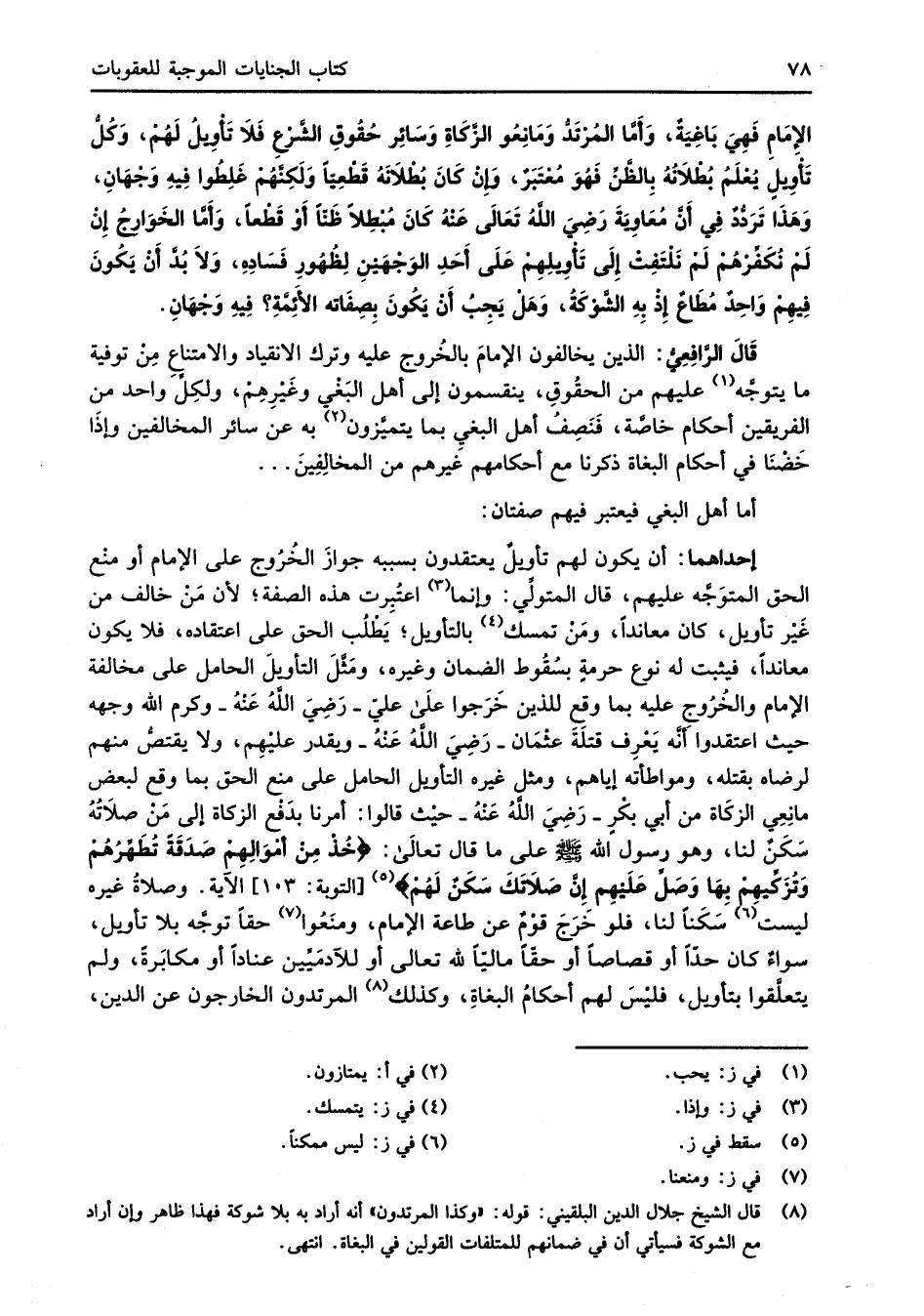 الإِمَامِ فَهِيَ بَاغِيَةٌ، وَأَمَّا المُرْتَدْ وَمَانِعُو الزَّكَاةِ وَسَائِر حُقُوقِ الشَّرْعِ فَلاَ تَأْوِيلُ لَهْمْ، وَكُلُّ تَأْوِيلٍ يُعْلَمُ بُطْلاَنُهُ بِالظَّنِّ فَهُوَ مُعْتَبَرٌ، وَإِنْ كَانَ بُطْلاَنُهُ قَطْعِيّاً وَلَكِنَّهْمْ غَلِطُوا فِيهِ وَجْهَانِ، وَهَذَا تَرَدُّدٌ فِي أَنَّ مُعَاوِيَةَ رَضِيَ اللهُ تَعَالَى عَنْهُ كَانَ مُبْطِلاً ظَنّاً أَوْ قَطْعاً، وَأَمَّا الخَوَارجُ إِنْ لَمْ نُكَفِّرْفهْم لَمْ نَلْتَفِتْ إِلَى تَأْوِيلِهِمْ عَلَى أَحَدِ الوَجْهَيْنِ لِظُهْورِ فَسَادِهِ، وَلاَ بُدَّ أَنْ يَكُونَ فِيهِمْ وَاحِدٌ مُطَاعٌ إذْ بِهِ الشَّوْكَةُ، وَهَلْ يَجِبُ أَنْ يَكونَ بِصِفَاته الأَئِمَّةِ؟ فِيهِ وَجْهَانِ.