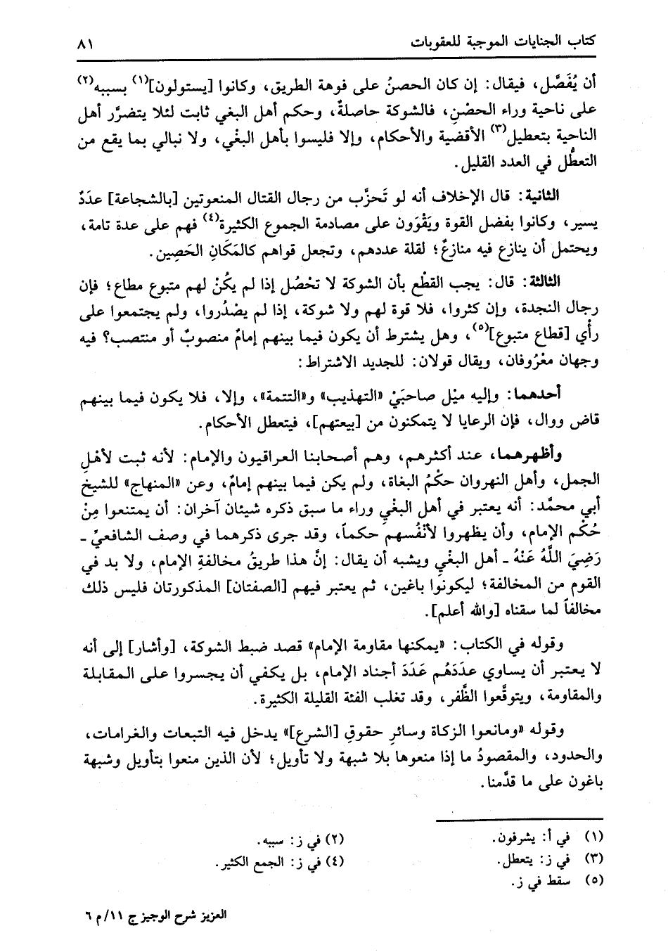 وقوله في الكتاب: "يمكنها مقاومة الإِمام" قصد ضبط الشوكة، [وأشار] إلى أنه لا يعتبر أن يساوي عدَدَهُم عَدَدَ أجناد الإِمام، بل يكفي أن يجسروا على المقابلة والمقاومة، ويتوقَّعوا الظَّفر، وقد تغلب الفئة القليلة الكثيرة.